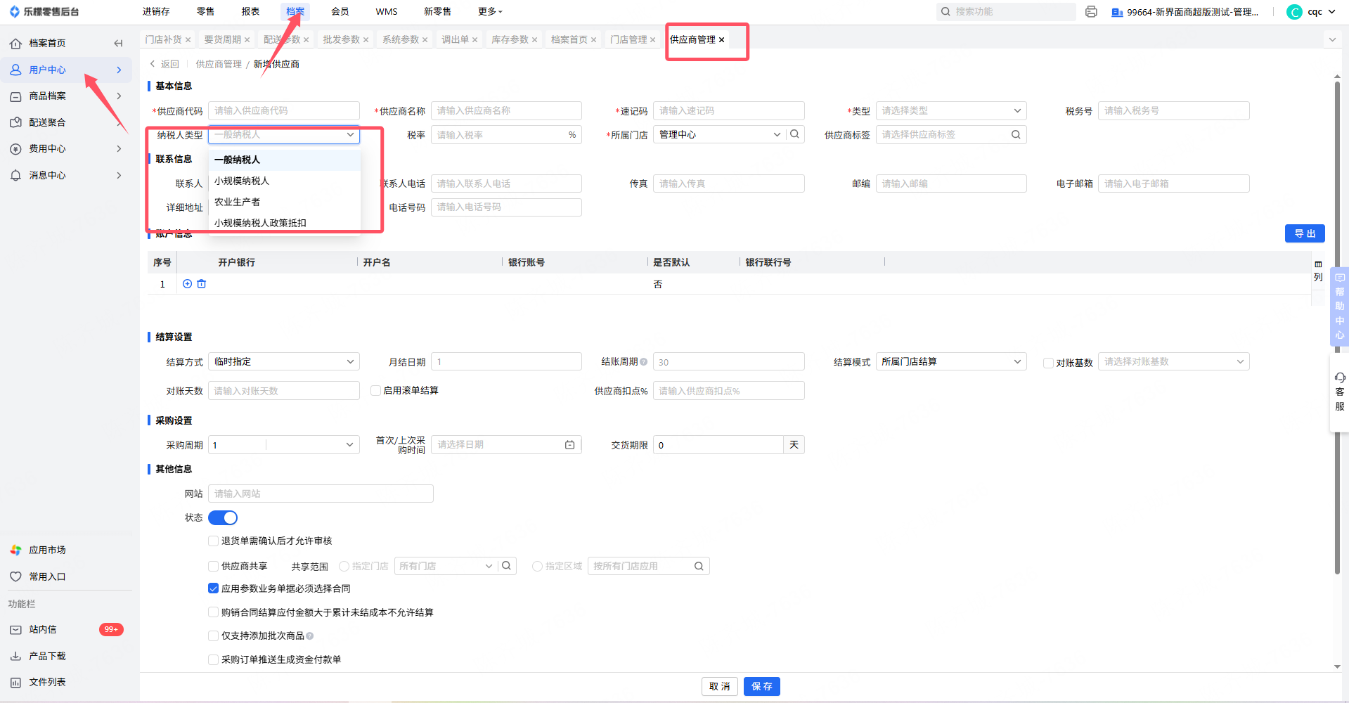门店管理和供应商管理中有字段:纳税人类型。