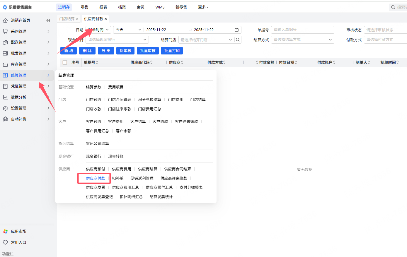 当开启【启用供应商付款单】 时显示供应商付款功能,付款(预付冲应付)的相关操作从供应商结算单中独立出来,转移到供应商付款单中进行。