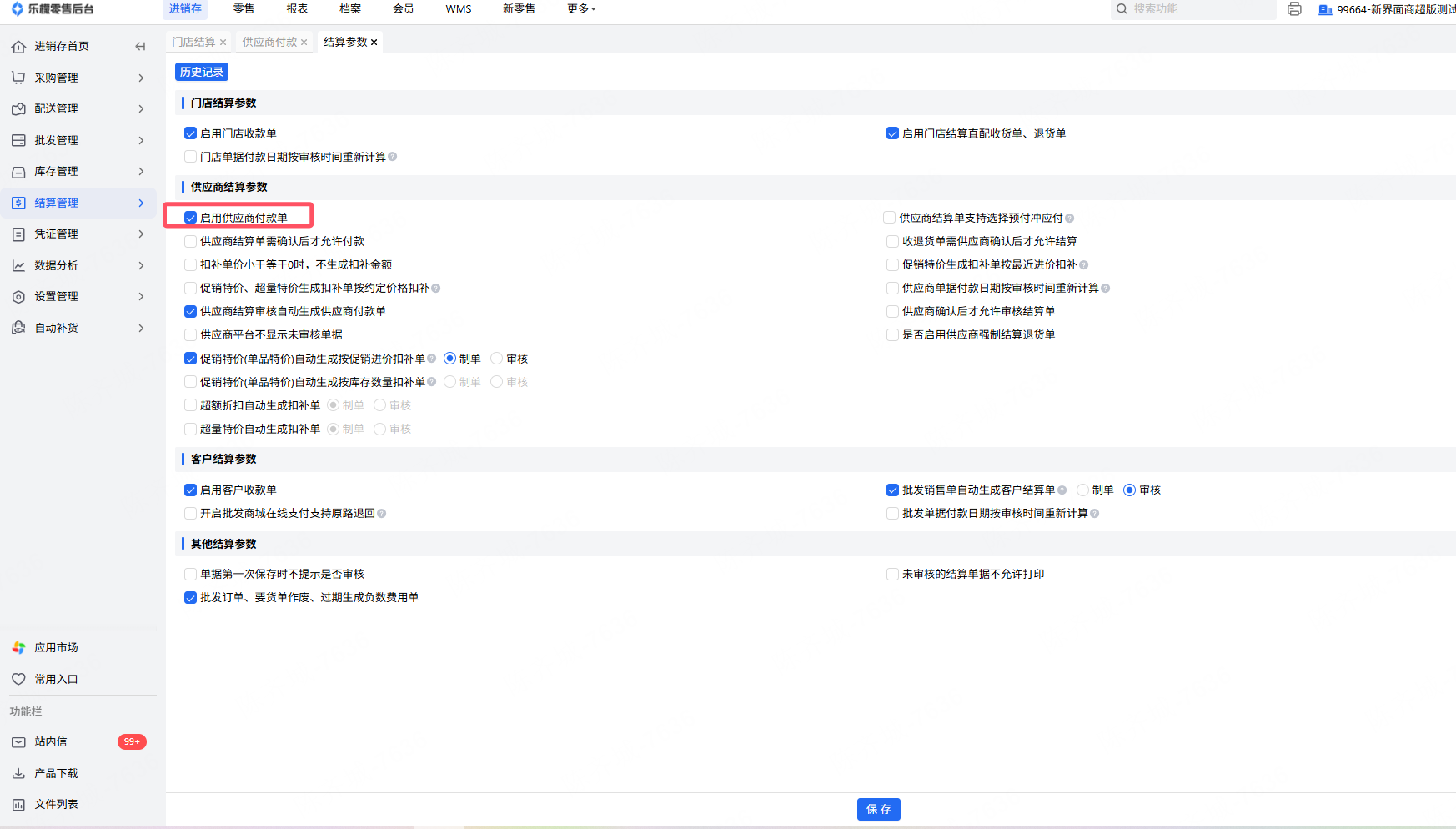 👉【操作路径】:进销存-结算管理-基础设置-结算参数