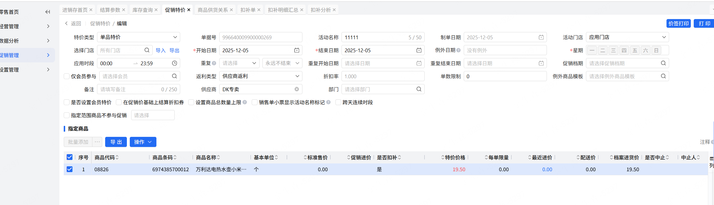 案例08826,库存单价19.5,促销特价中促销进价也填写19.5
