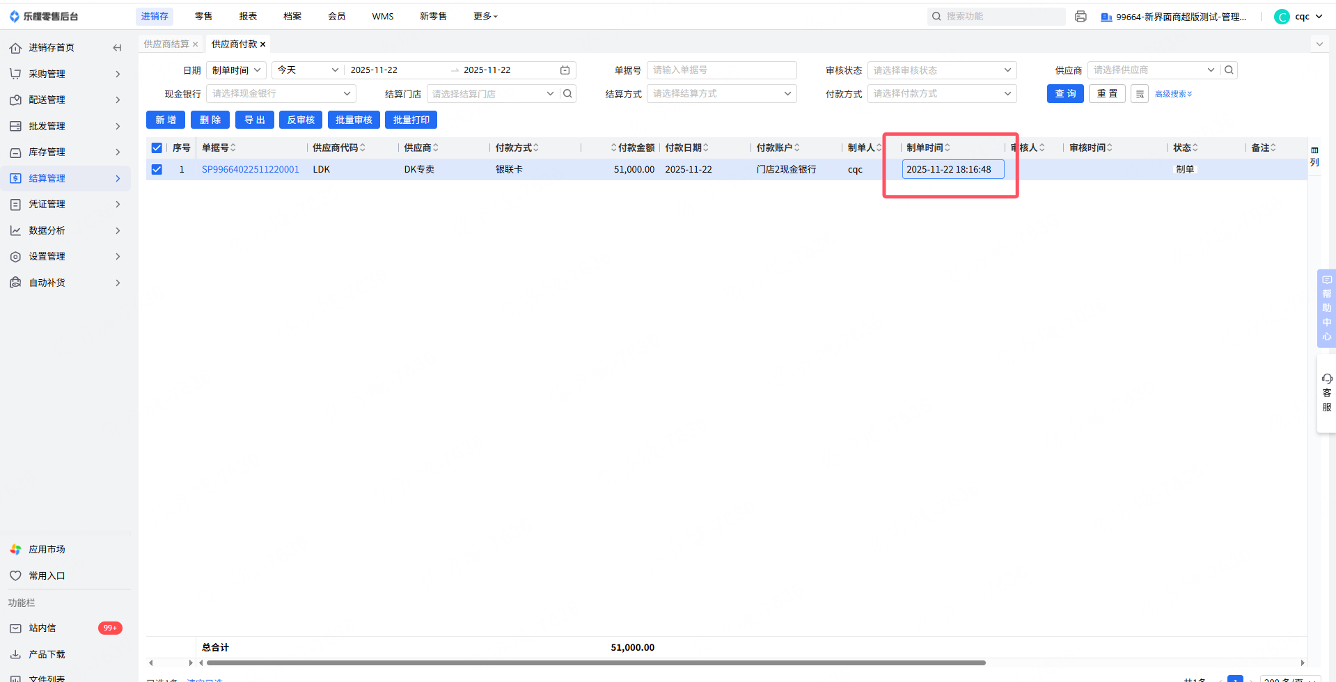 开启参数后供应商结算审核后,自动生成“制单”状态供应商付款单。对应付款单值如下