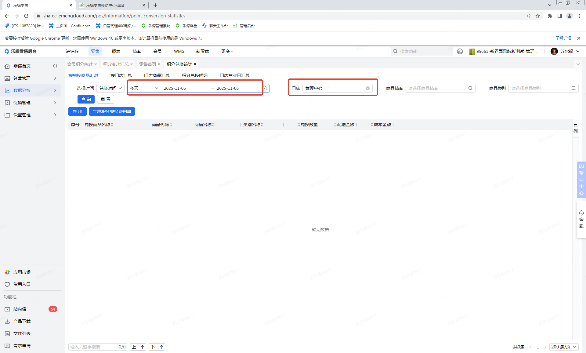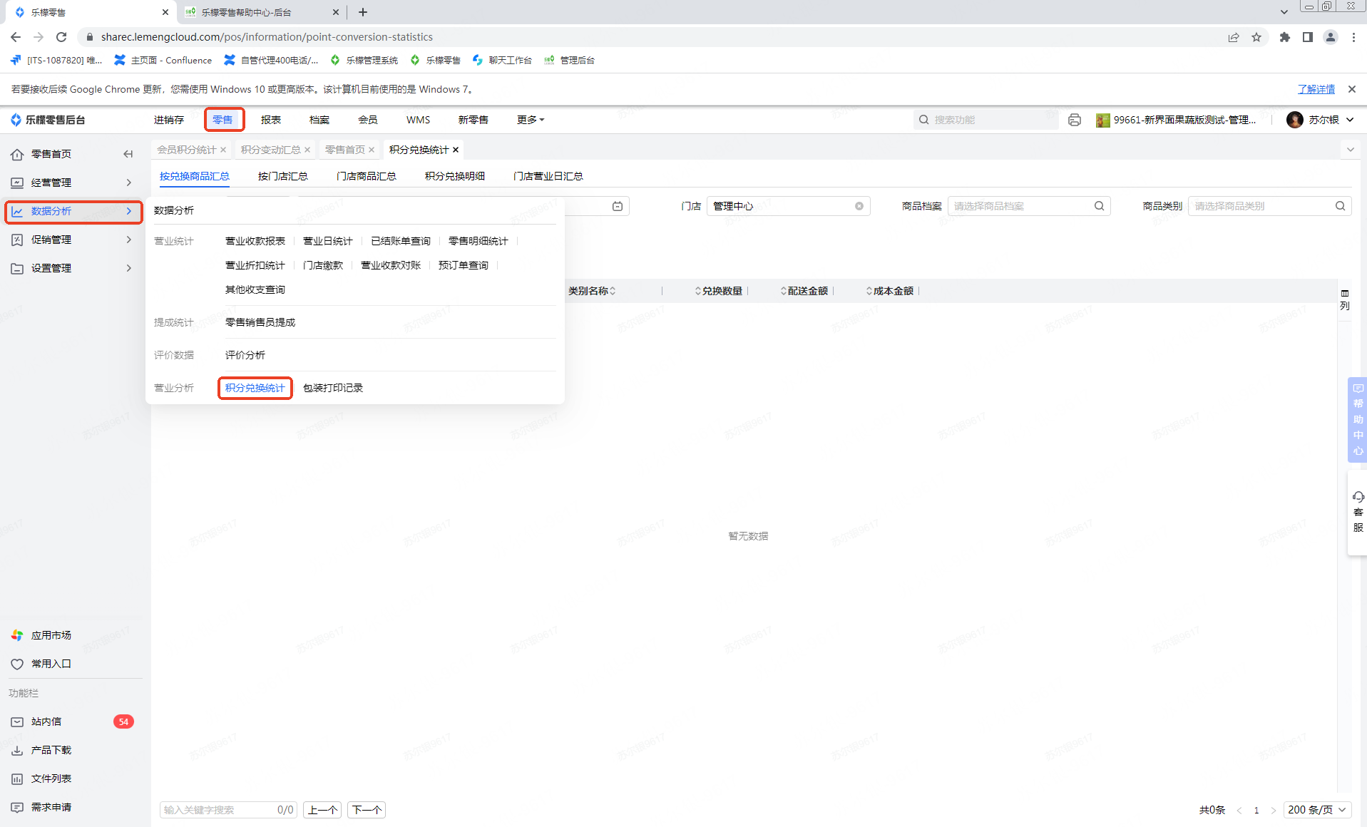 登录乐檬后台,零售-数据分析-积分兑换统计