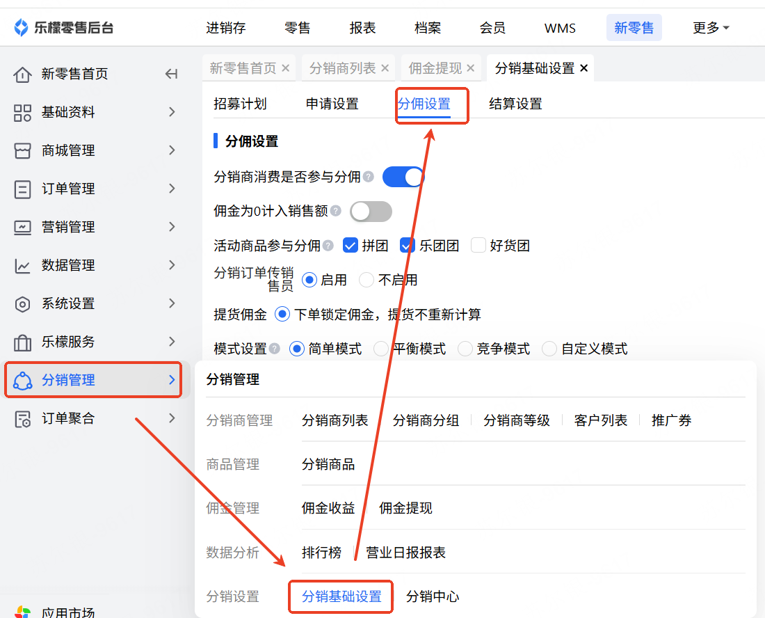 场景3(需要新零售V2专业版):结合场景1、2,分销商有自己的流量、店铺,与商家寻求合作,分销商推广商家商品,商家提前将商品放置到分销商店铺中(在分销商处下单并提货),同时给予分销商商品佣金与提货佣金