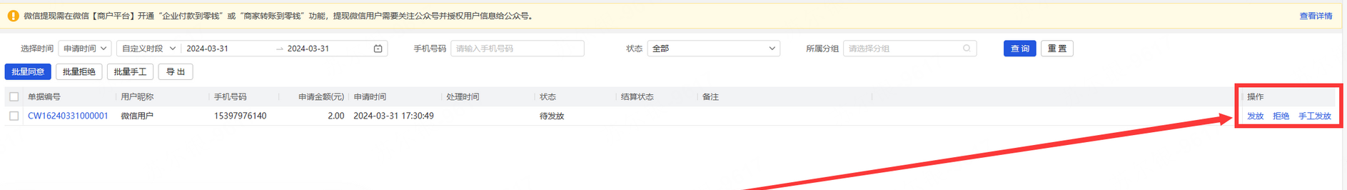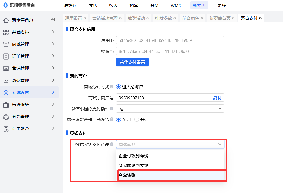 若新零售-系统设置-聚合支付中,配置的是”商家转账“,分销商发起提现,商家在新零售-分销管理-佣金提现界面,点击分销商提现申请后方的“微信发放”。