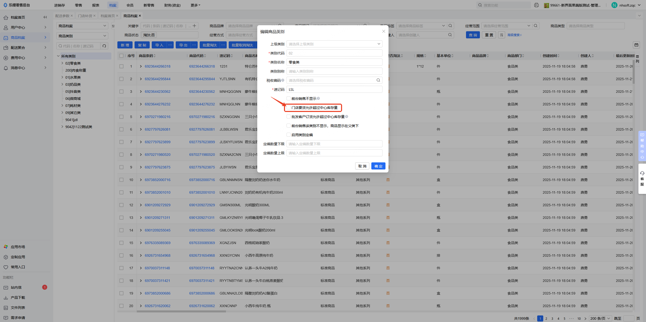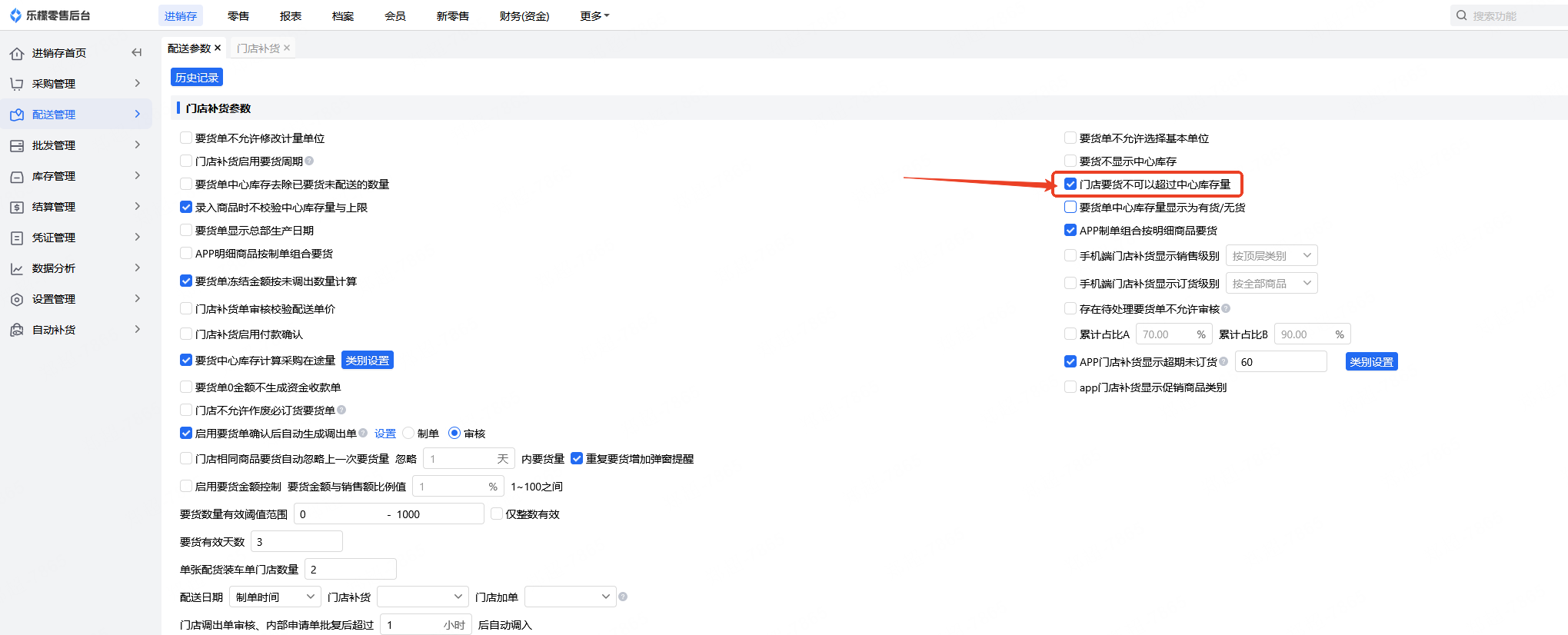 👉【操作路径】:进销存-配送管理-配送参数-门店要货不可以超过中心库存量