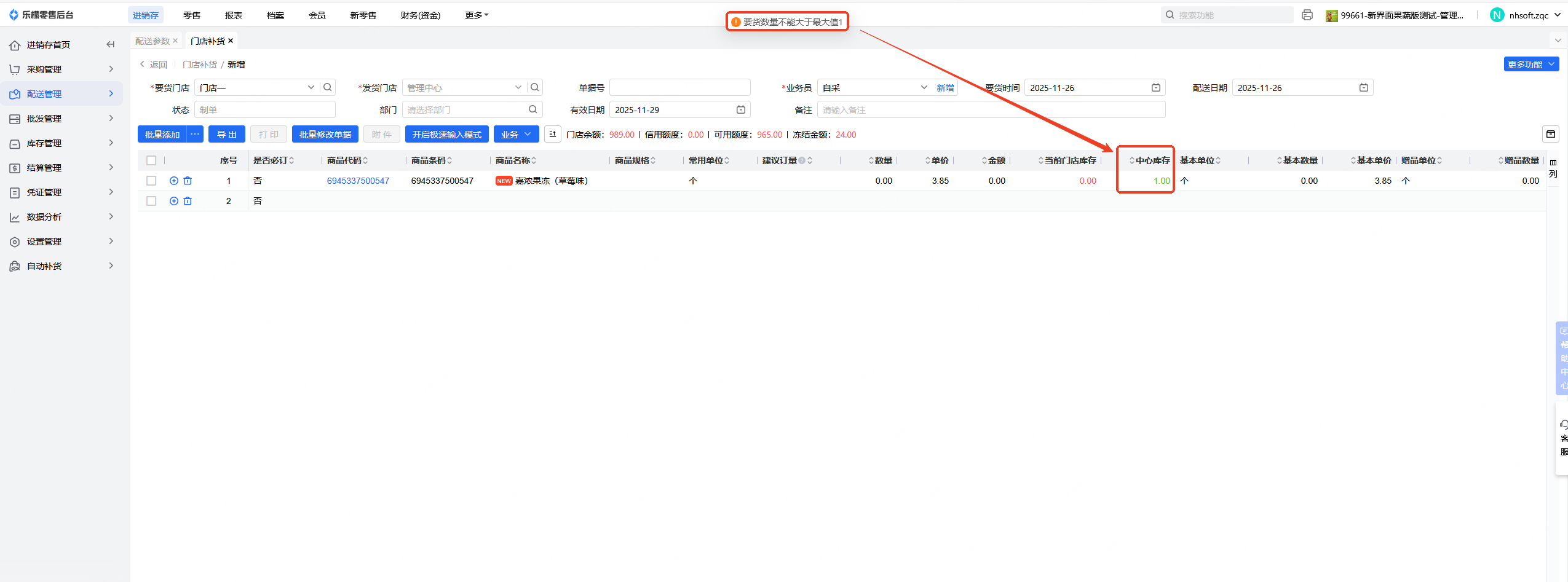 参数勾选后,门店要货不可以超过中心库存量。