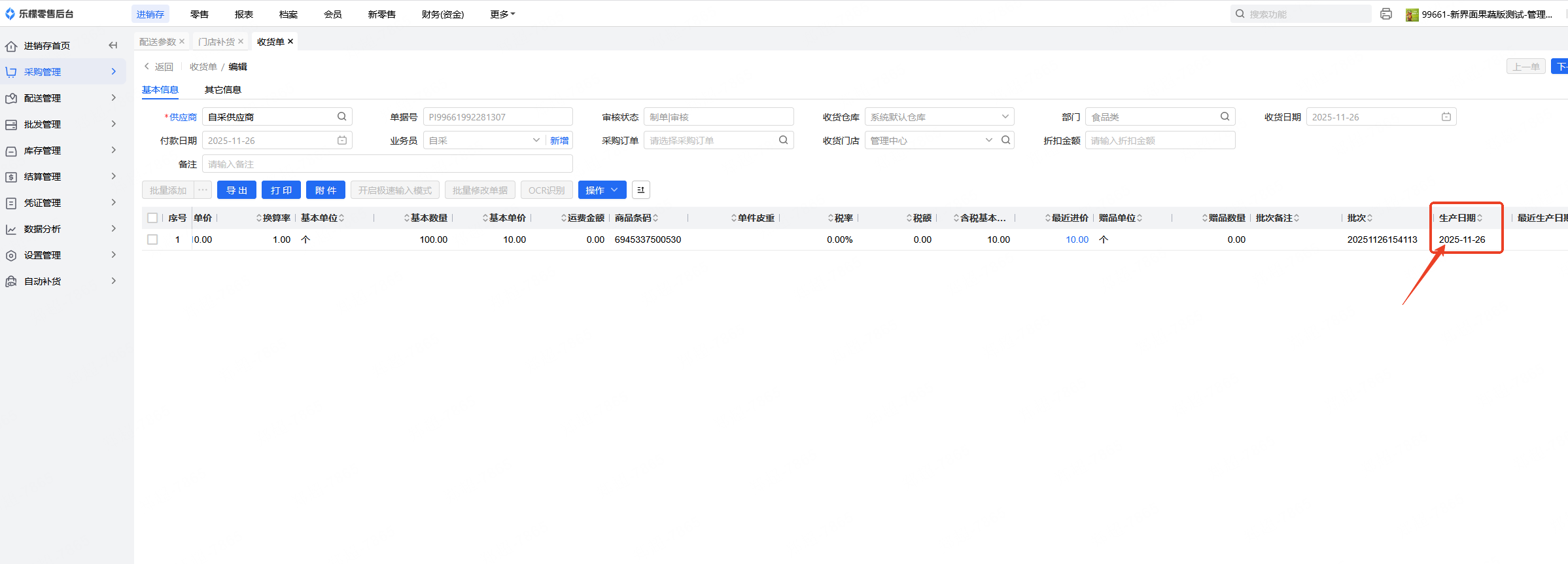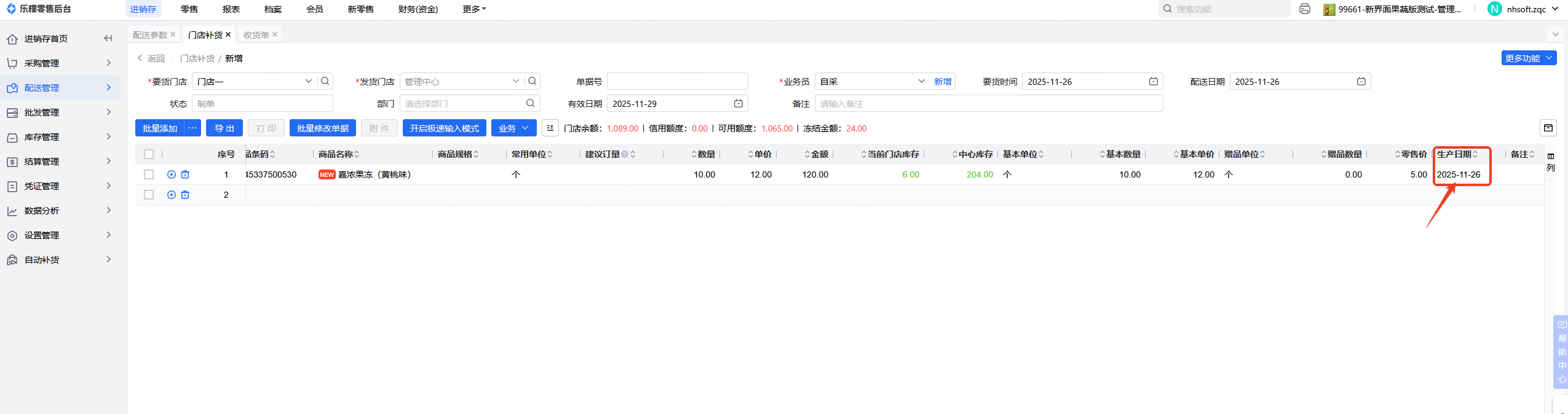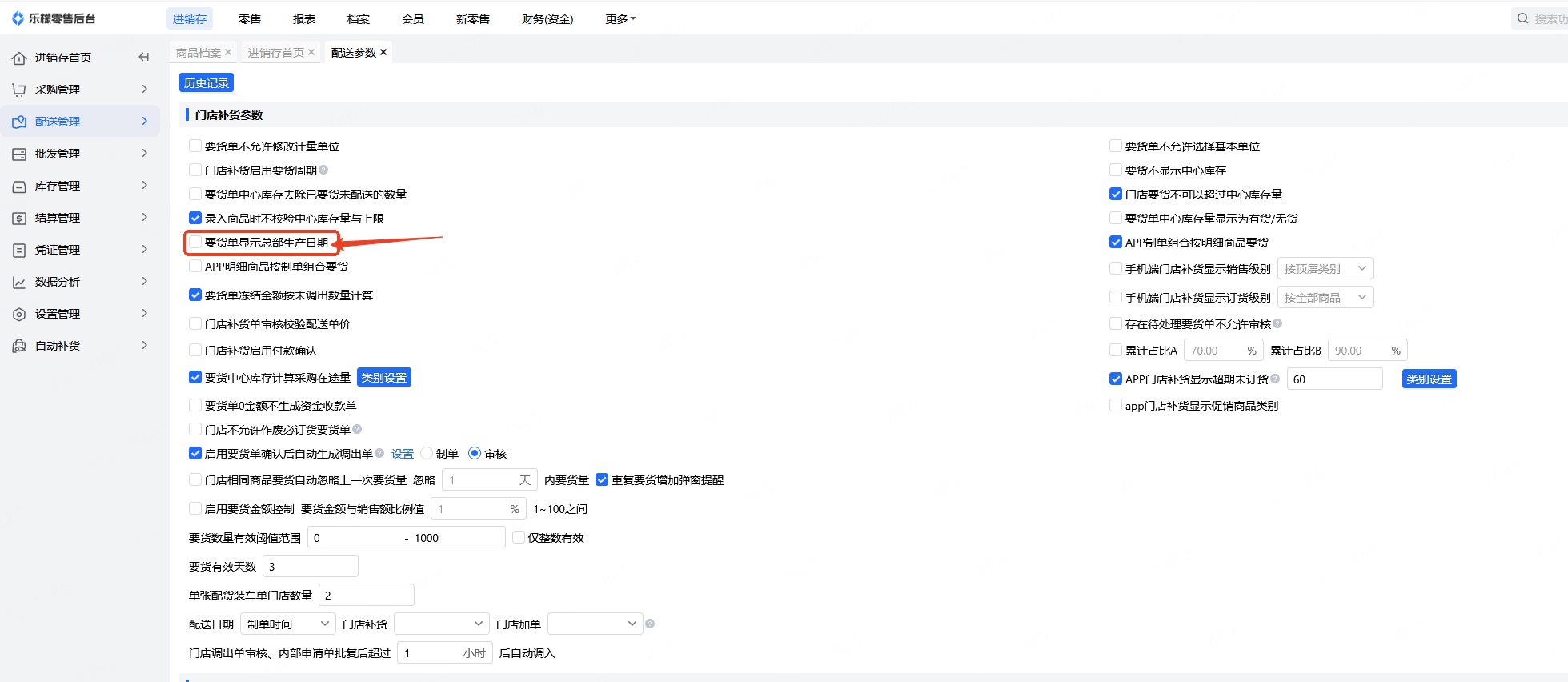 👉【操作路径】:进销存-配送管理-配送参数-要货单显示总部生产日期