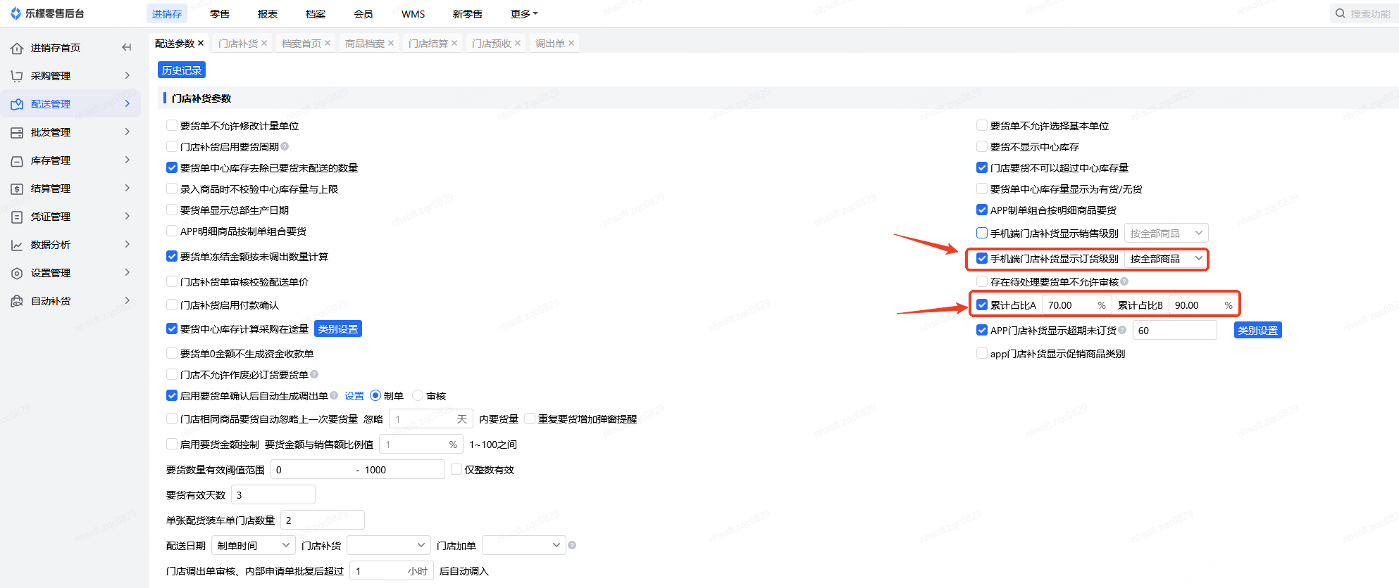 开启参数乐檬APP门店要货会增加商品标签,需要和下方累计占比A(%)__累计占比B(%)__结合使用