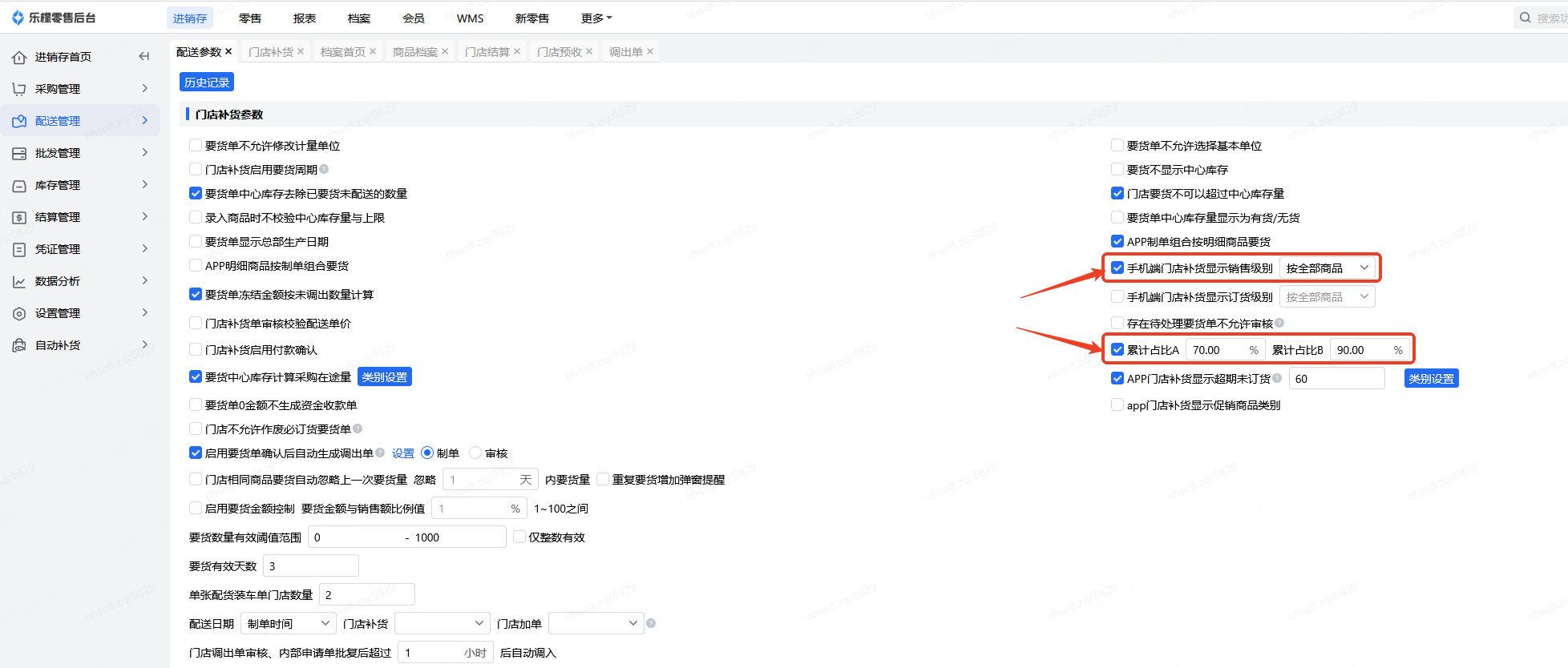 👉【操作路径】:进销存-配送管理-配送参数-手机端门店补货显示销售级别