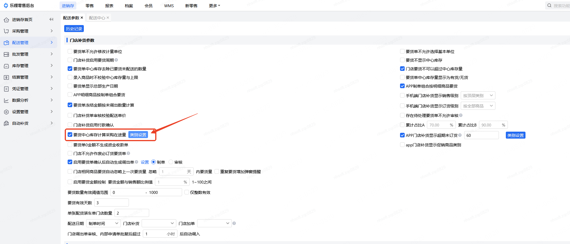 👉【操作路径】:进销存-配送管理-配送参数-要货中心库存计算采购在途量