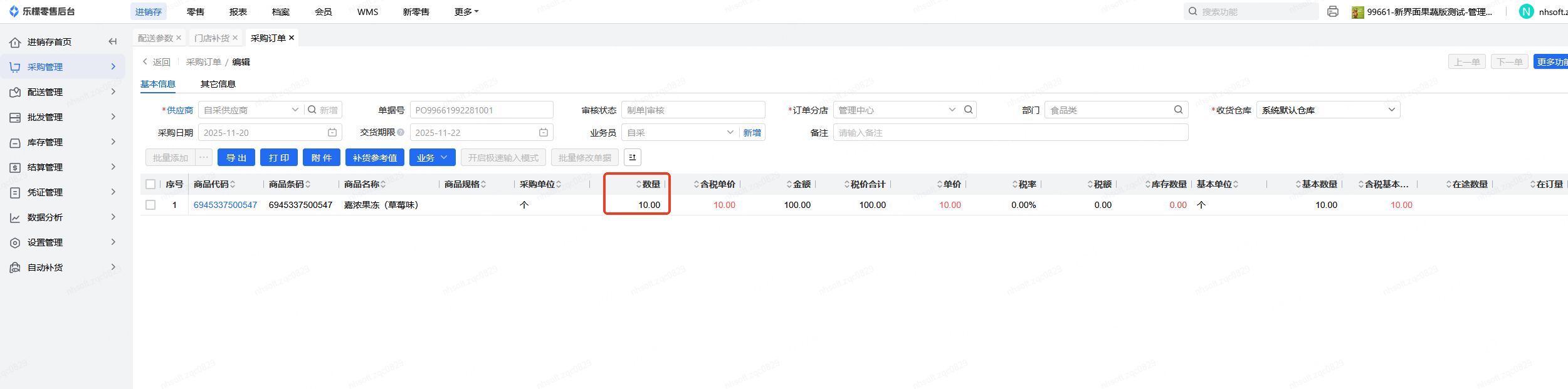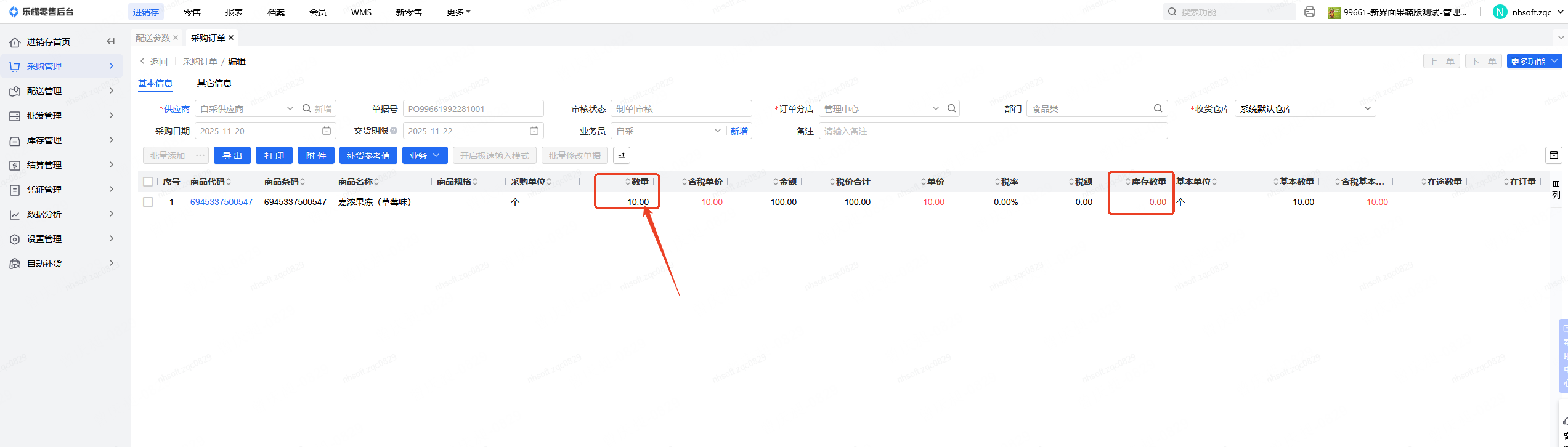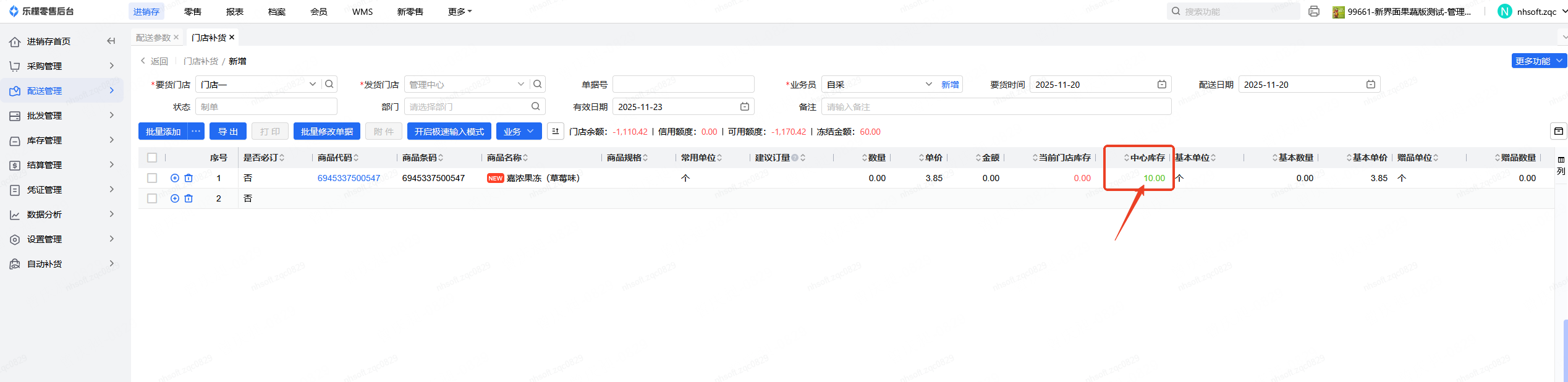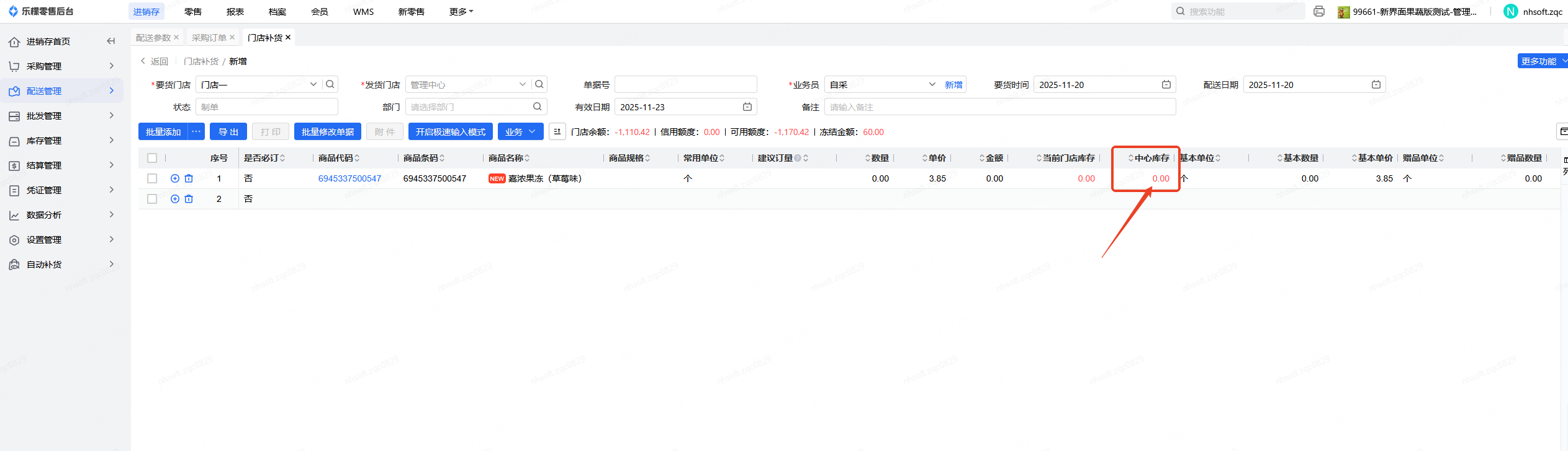 未开启参数,库存数量0,采购订单已审核未作废未失效未中止未收货数量为10,门店补货,显示中心库存为:0.