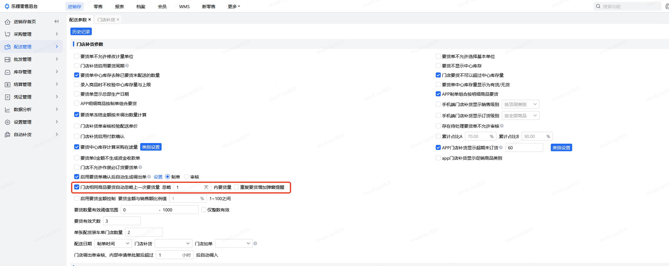 👉【操作路径】:进销存-配送管理-配送参数-门店相同商品要货自动忽略上一次要货量,忽略()天内要货量
