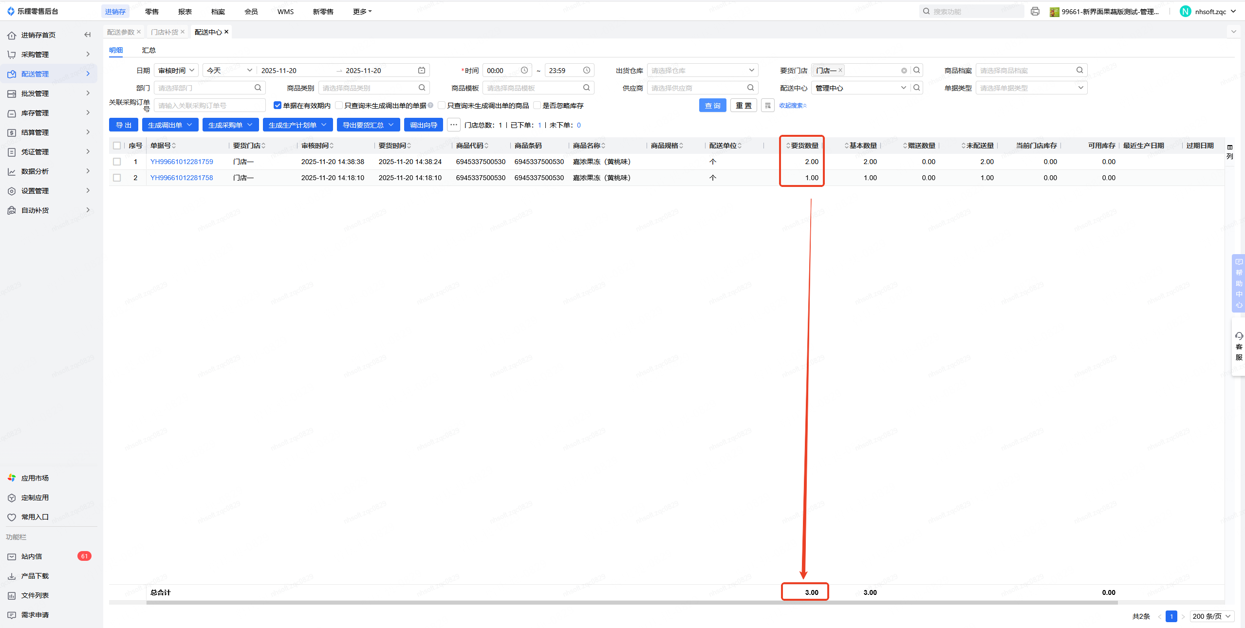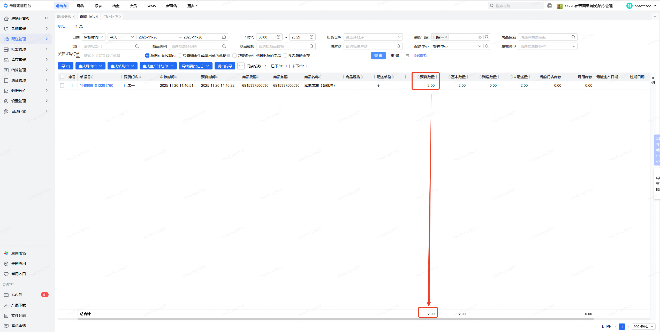 参数开启,同个门店同一个商品多次要货,配送中心只会显示门店最后一次要货的数量