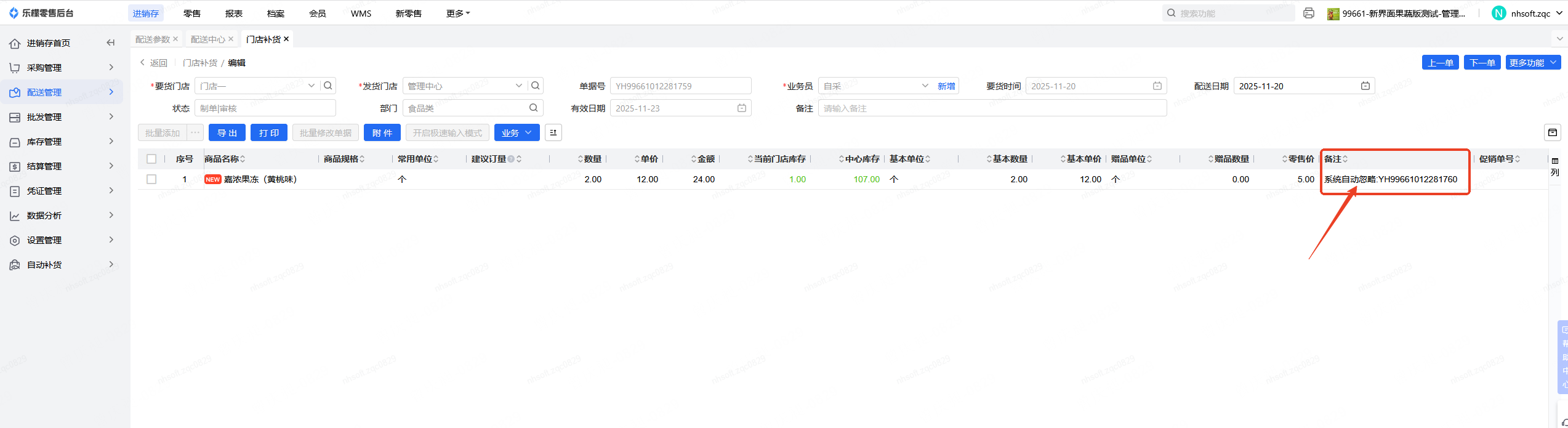 参数勾选后,同个门店同一个商品多次要货,配送中心只会显示门店最后一次要货的数量,忽略之前要货单数量,如果一个要货单据只是部分生成调出单,剩余部分也会忽略。(要货单上会有自动忽略备注)。