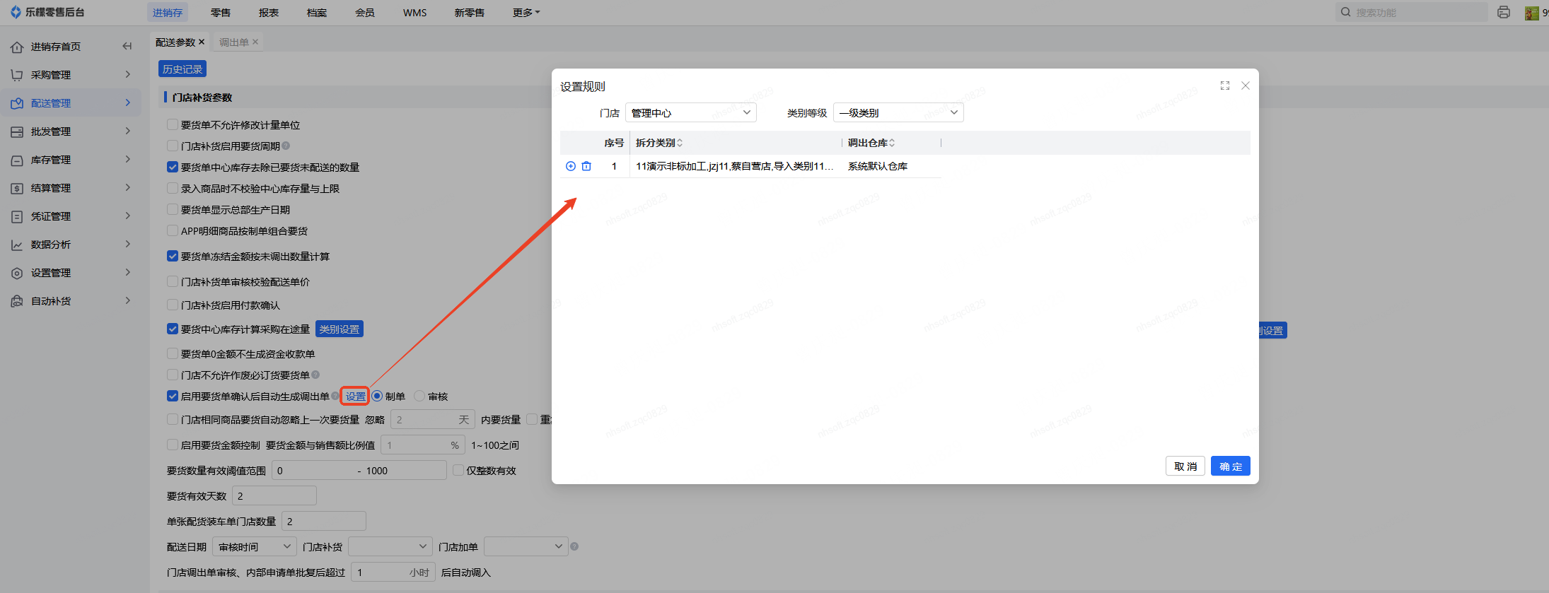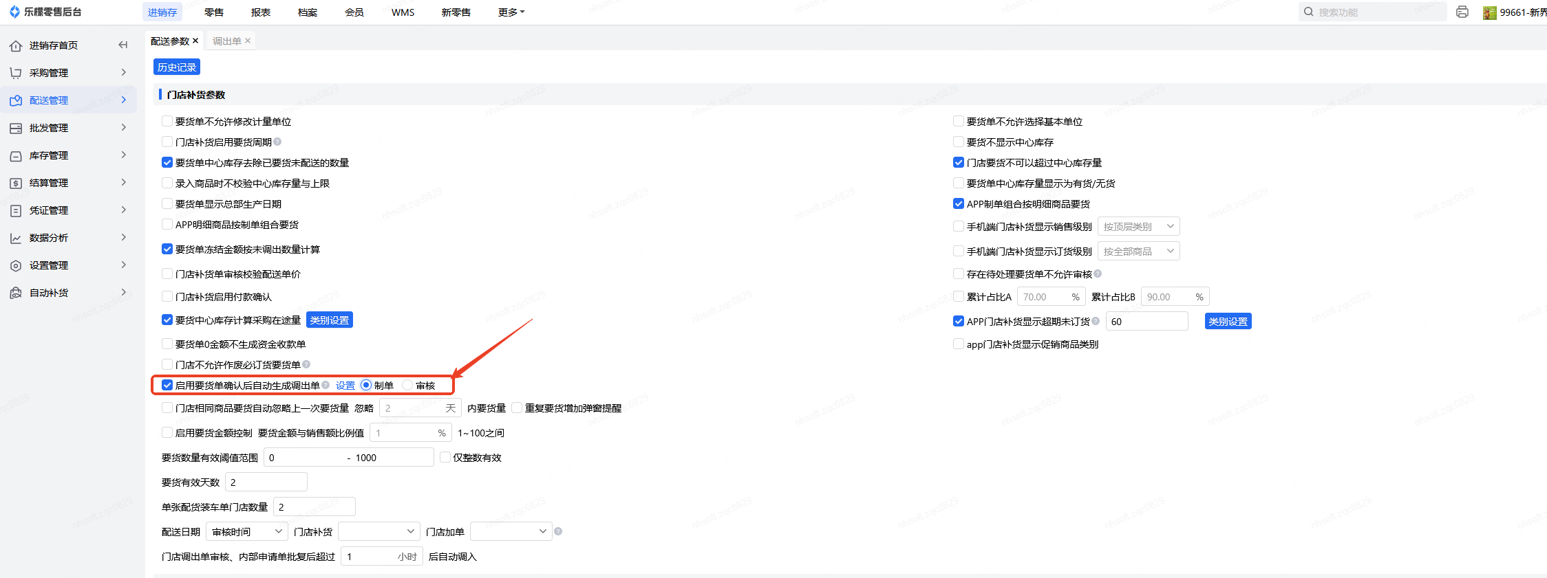 👉【操作路径】:进销存-配送管理-配送参数-启用要货单确认后自动生成调出单