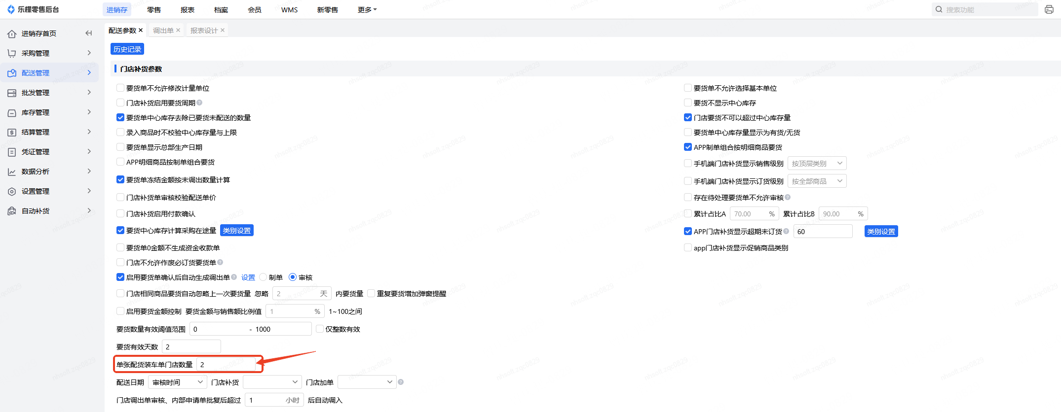 👉【操作路径】:进销存-配送管理-配送参数-单张配货装车单门店数量()