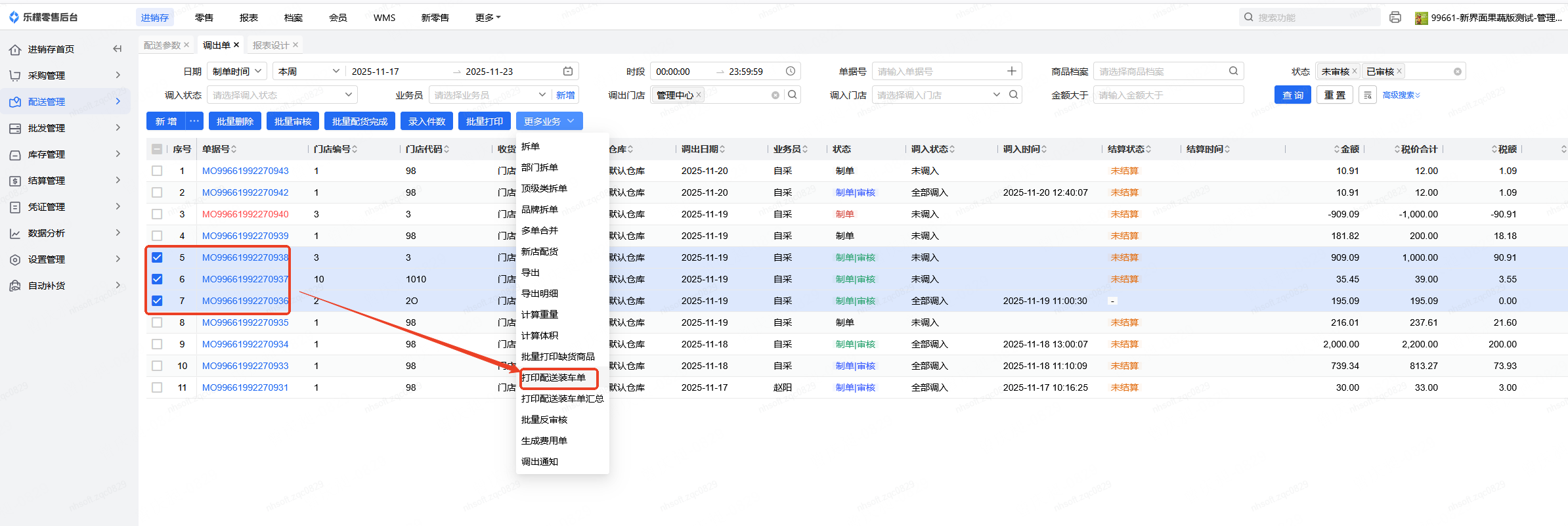 例如填写数值:2;调出单-打印配送装车单,选择了三家门店
