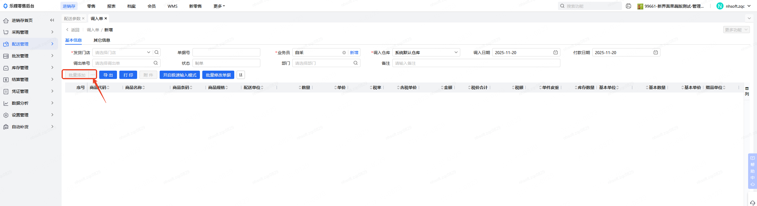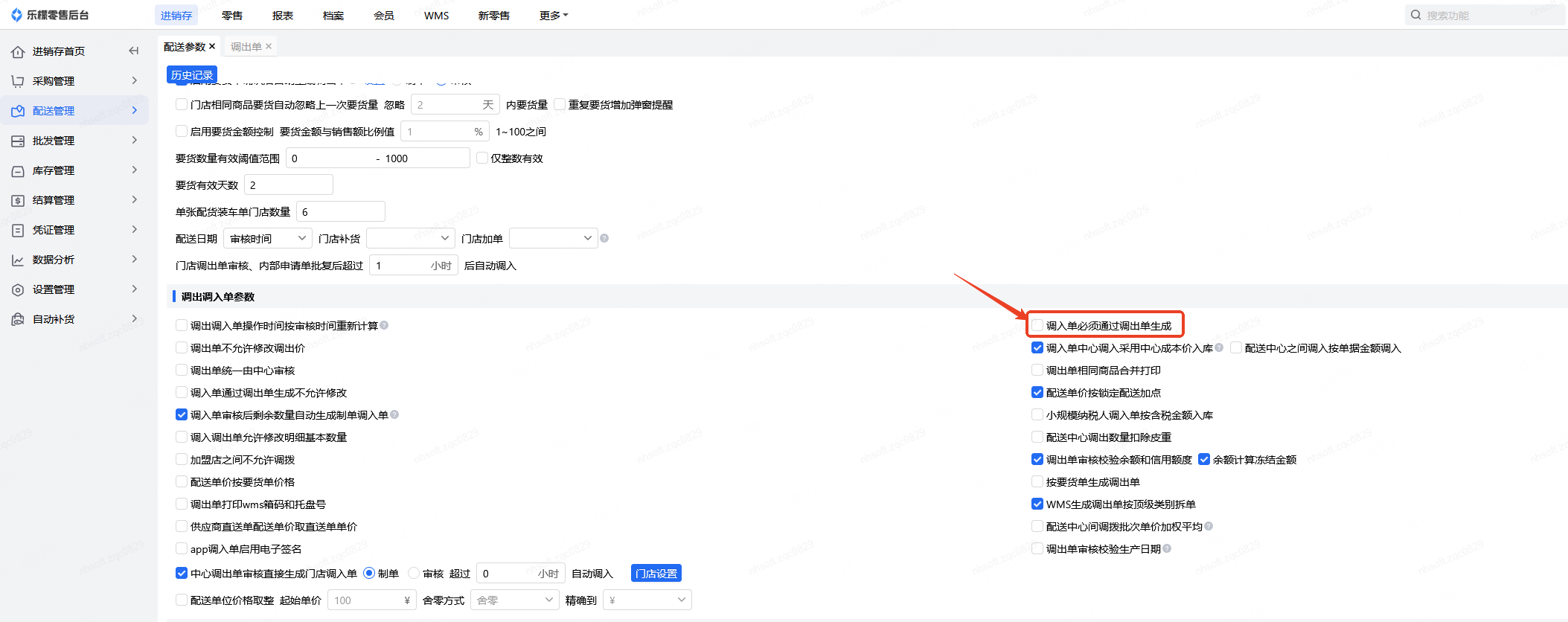 👉【操作路径】:进销存-配送管理-配送参数-调入单必须通过调出单生成