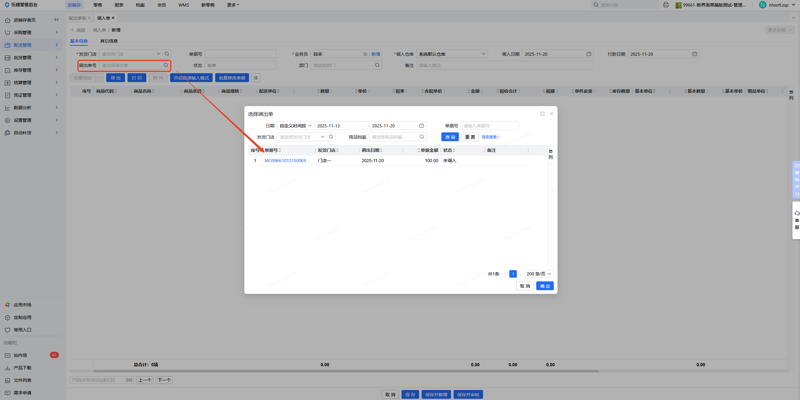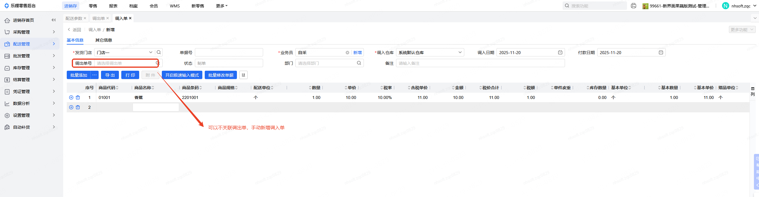 制作调入单只能通过调出单号选择生成调出单不能手动添加商品自定义调入。