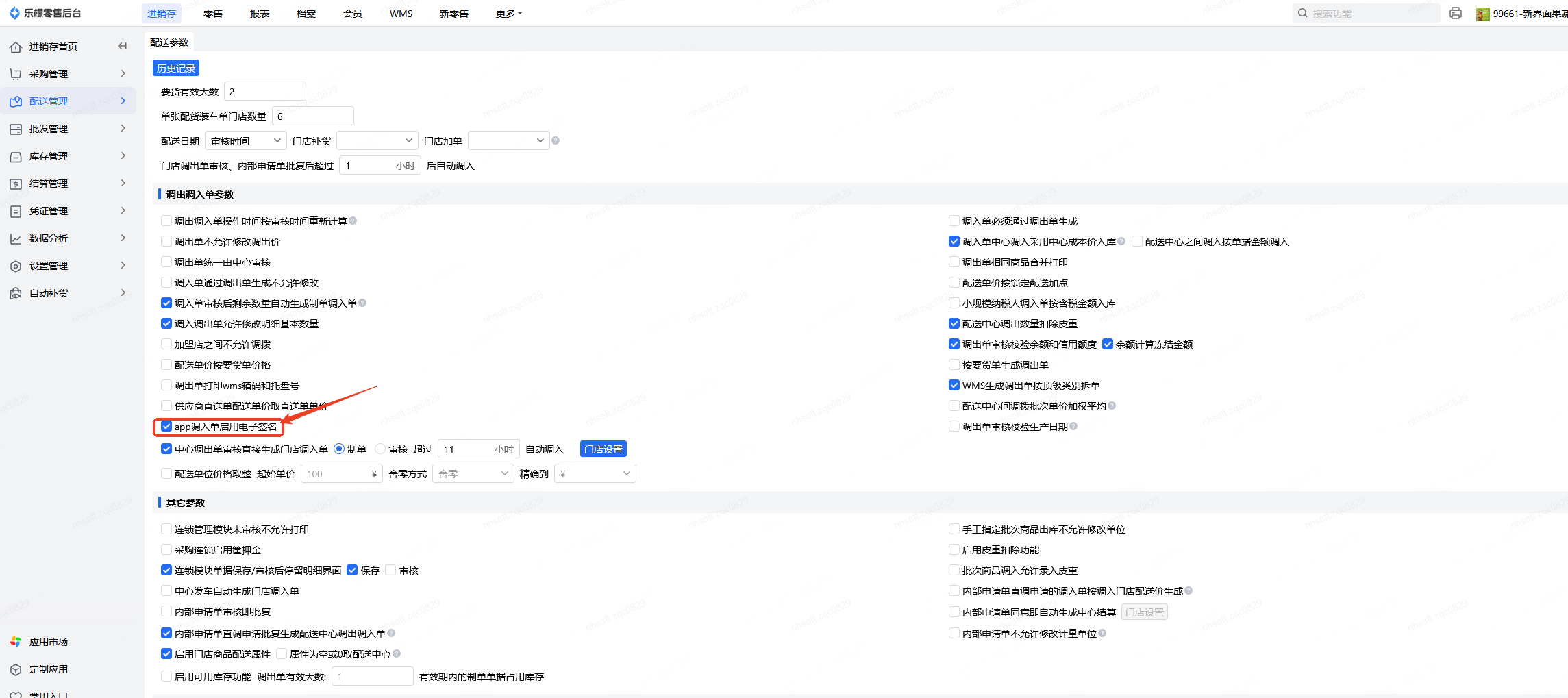 👉【操作路径】:进销存-配送管理-配送参数-app调入单启用电子签名