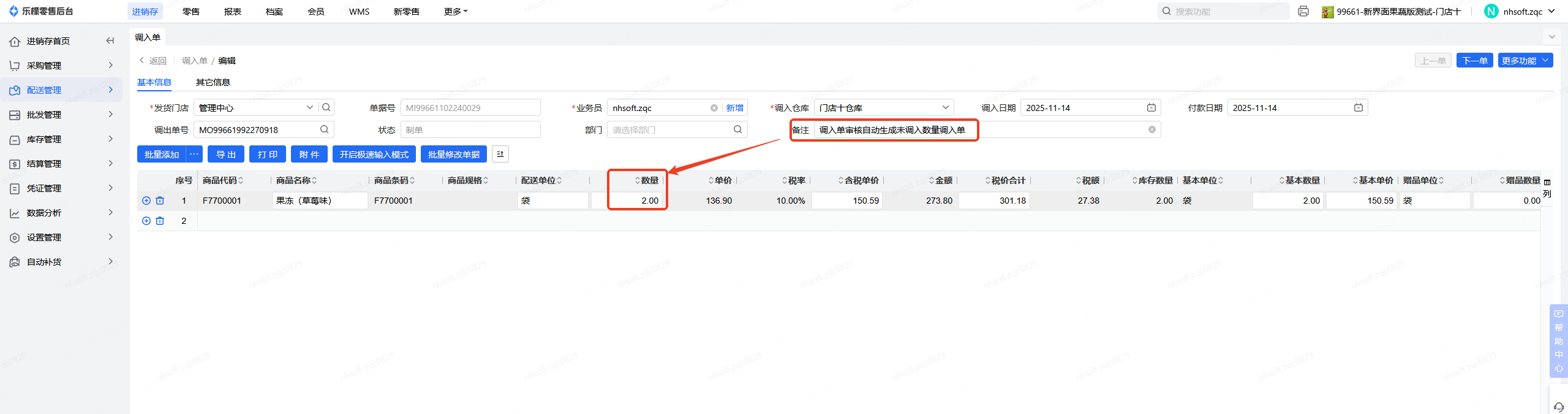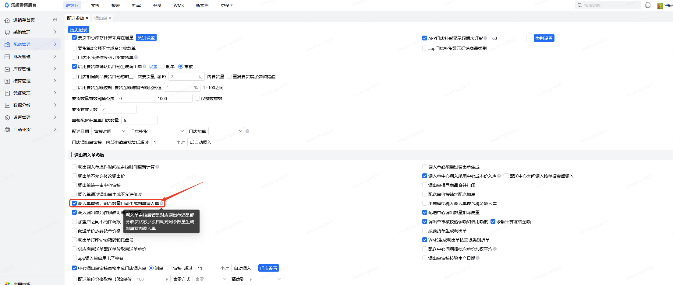 👉【操作路径】:进销存-配送管理-配送参数-调入单审核后剩余数量自动生成制单调入单