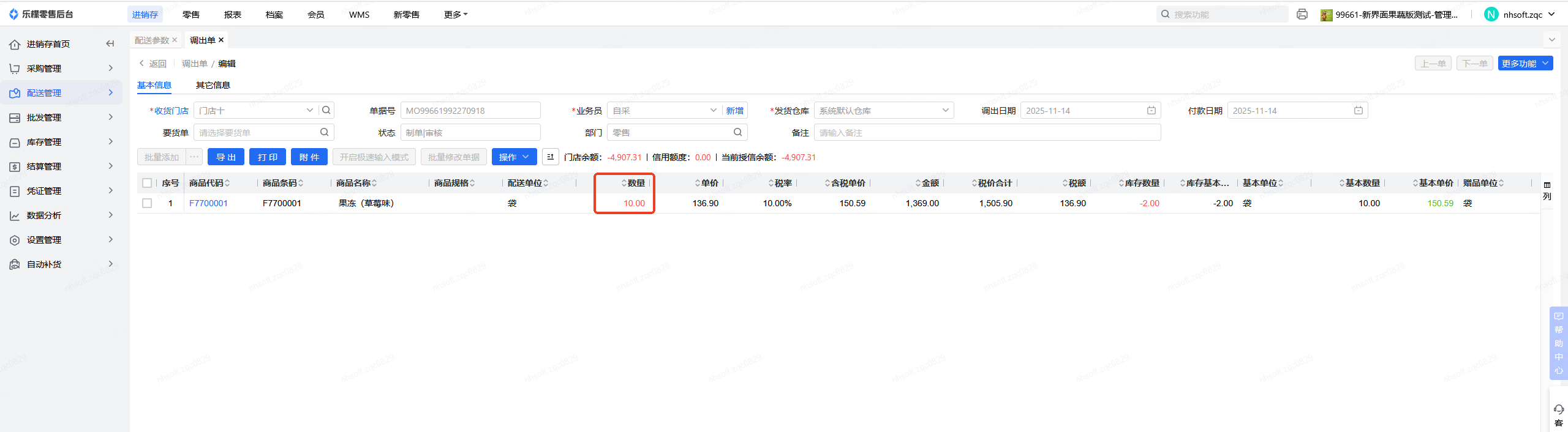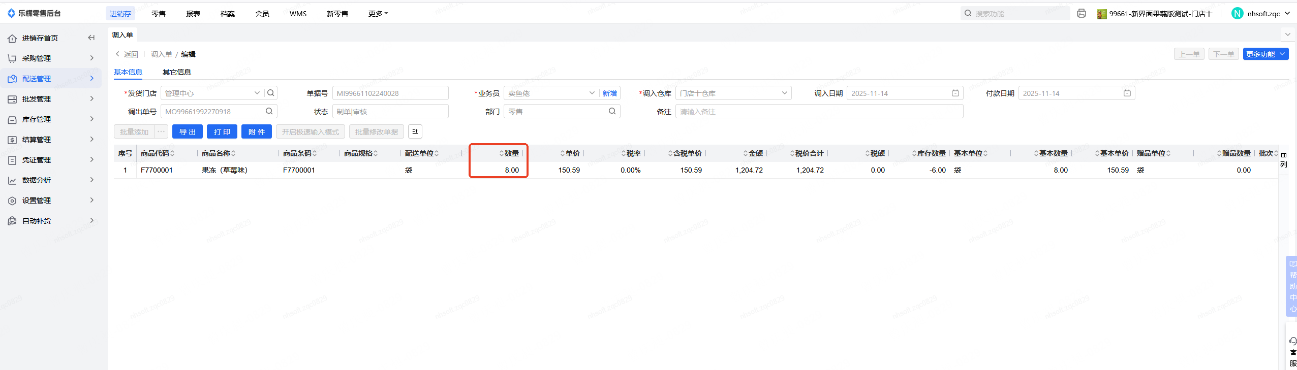 开启参数,例如调出单调出10件,调入单收货8件,剩余2件自动生成制单调入单