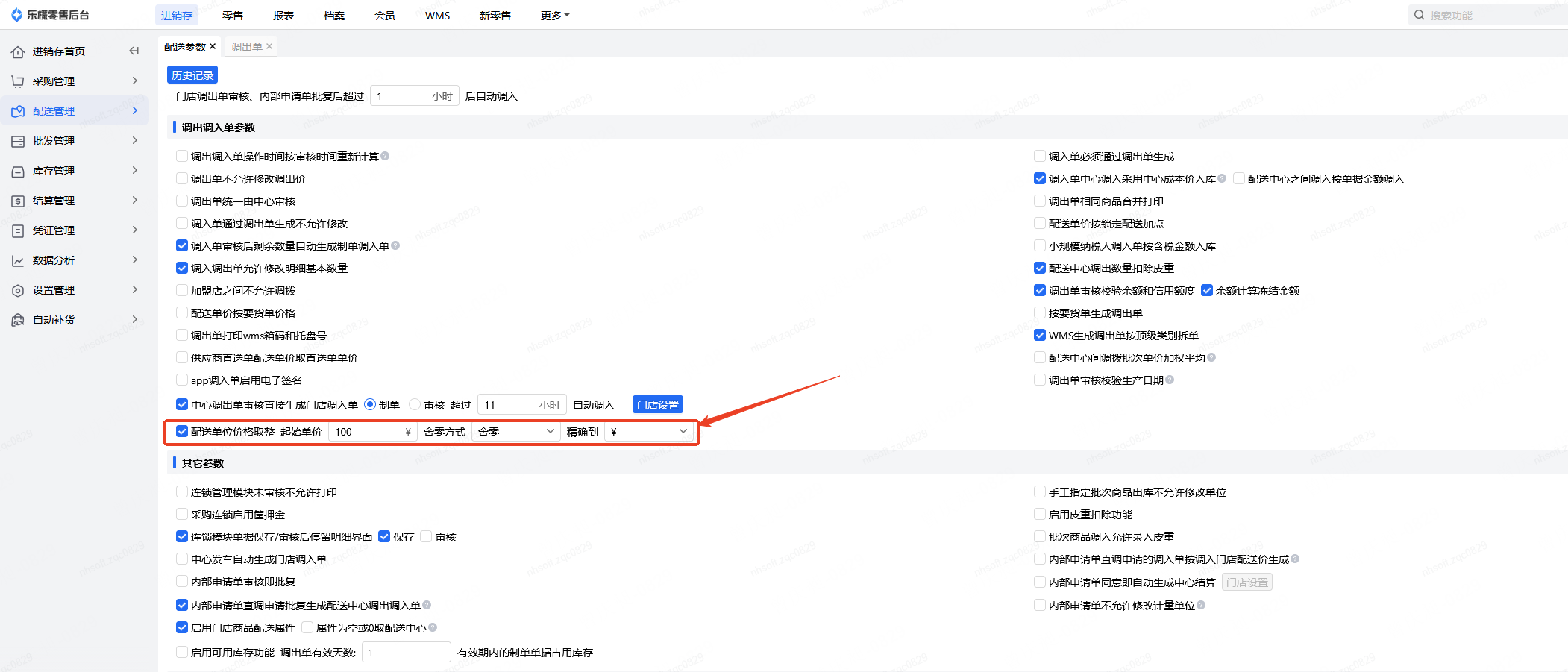 👉【操作路径】:进销存-配送管理-配送参数-配送单位价格取整