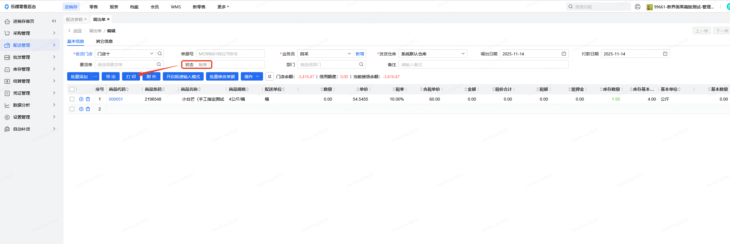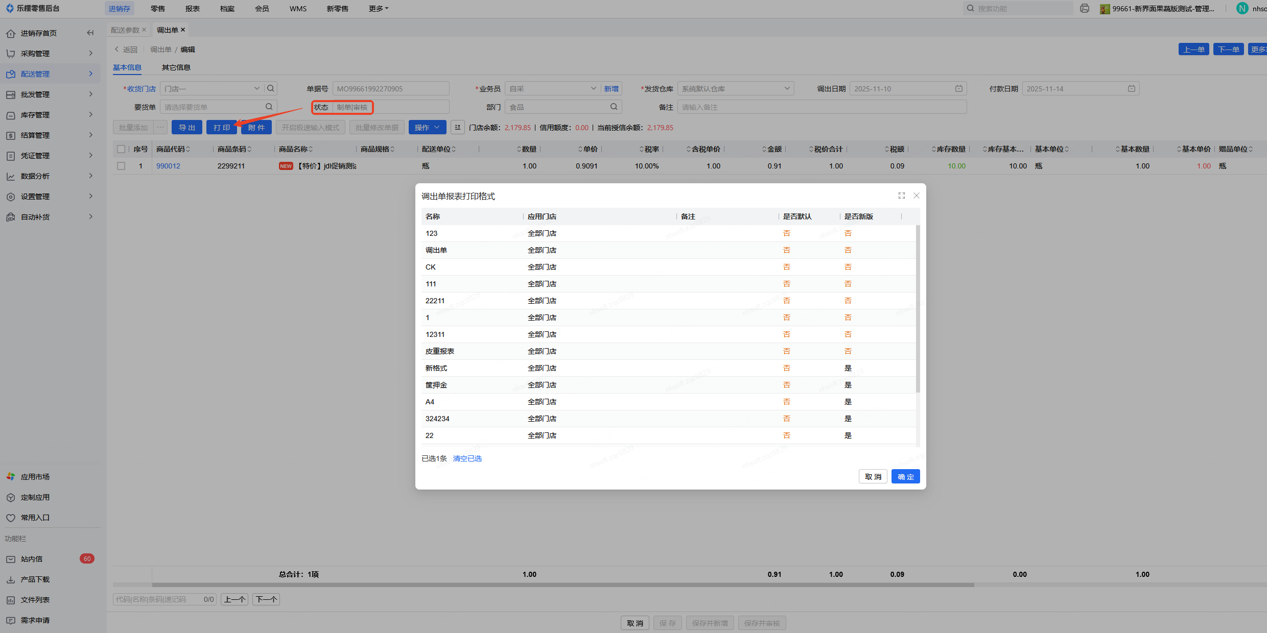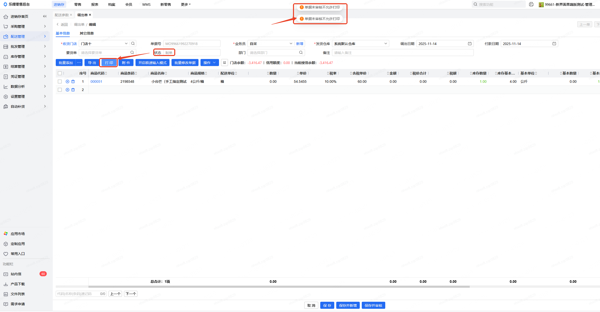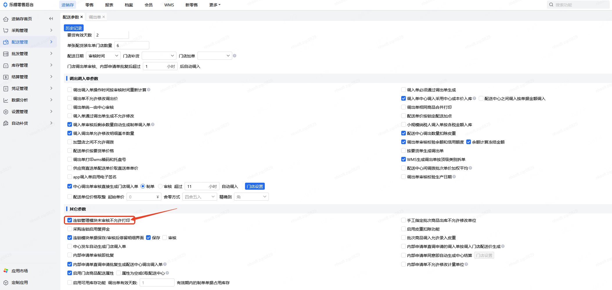 👉【操作路径】:进销存-配送管理-配送参数-连锁管理模块未审核不允许打印