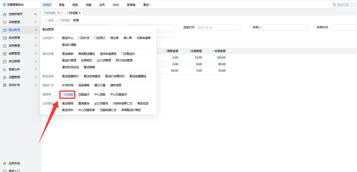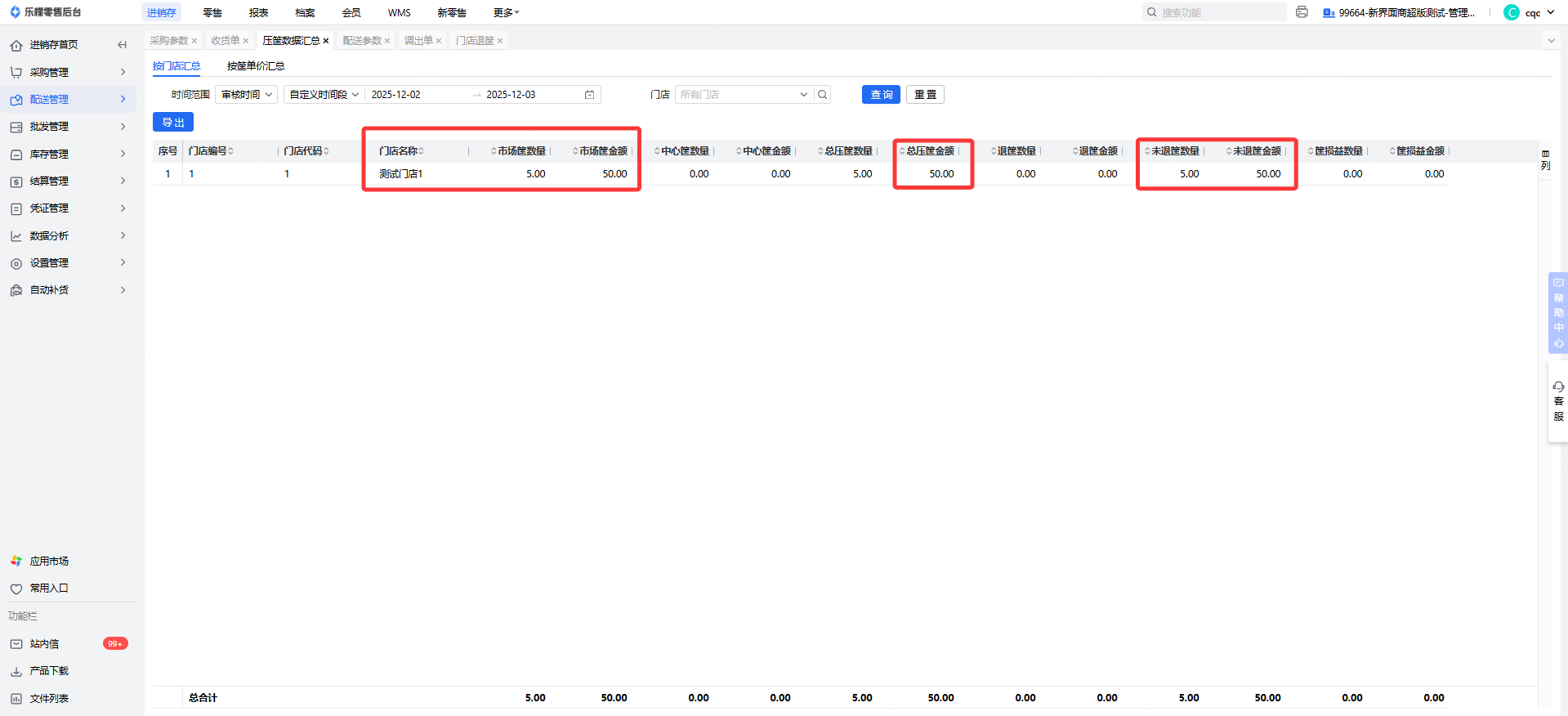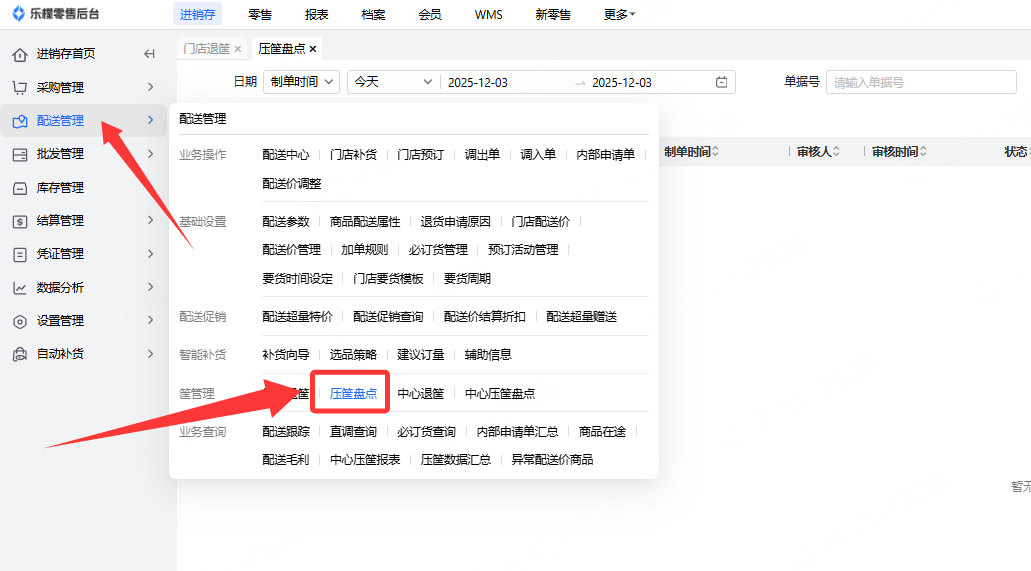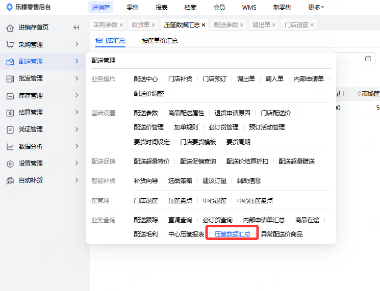 管理中心查询压筐数据到:配送管理-业务查询-压筐数据汇总