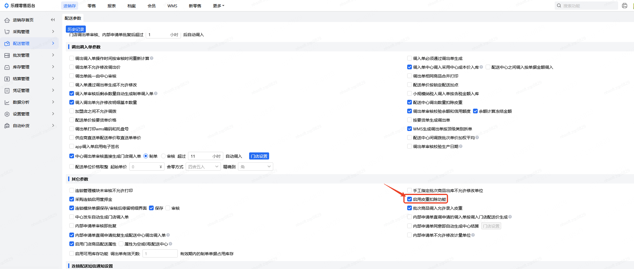 👉【操作路径】:进销存-配送管理-配送参数-启用皮重扣除功能
