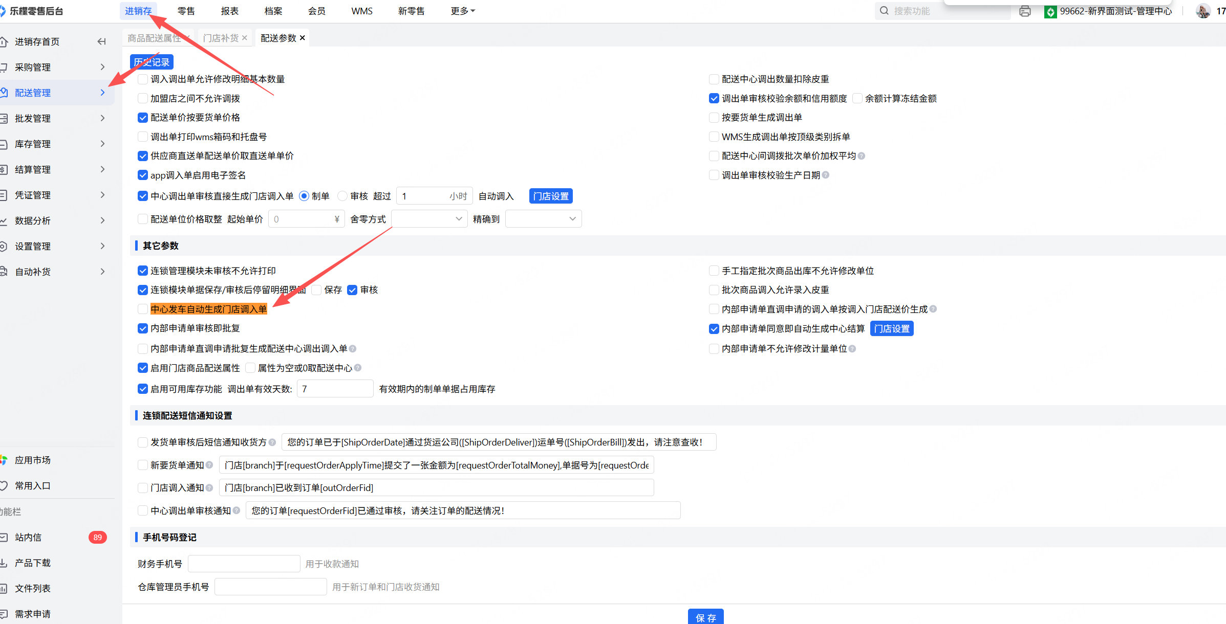 参数勾选后,配送中心发车单审核会自动生成审核状态的门店调入单。