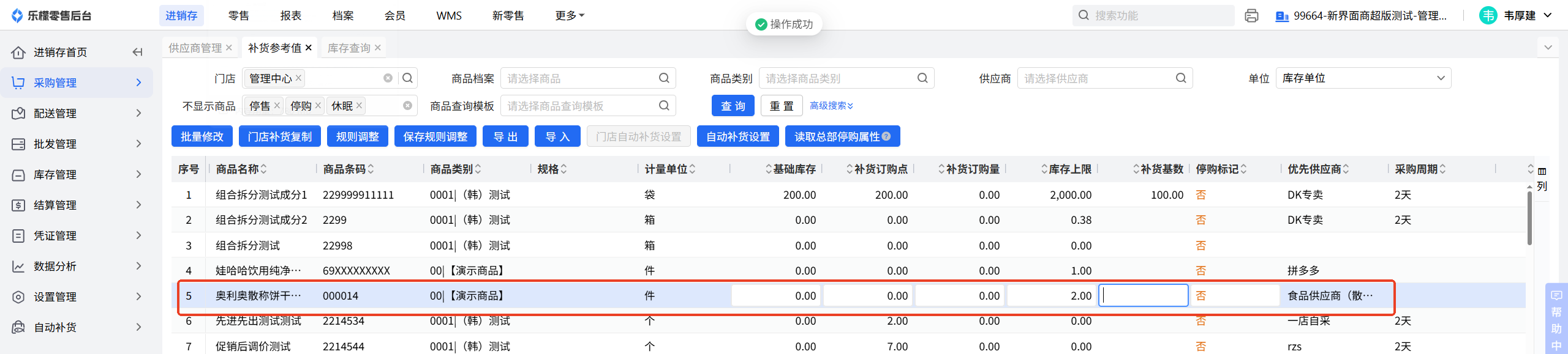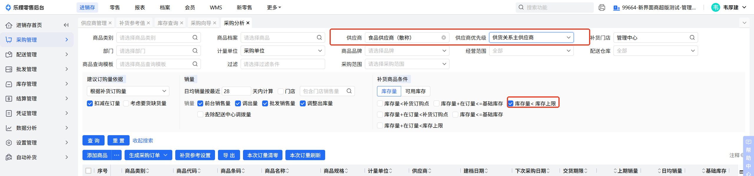 1.进销存-采购管理-基础设置-补货参考值 设置过,且补货分析-补货商品条件 满足