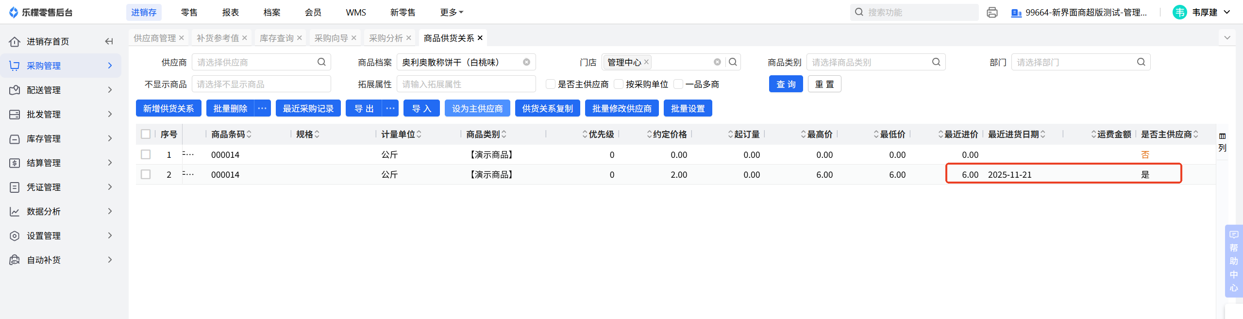 2.进销存-采购管理-商品供货关系,设置的是主供应商且有入库记录