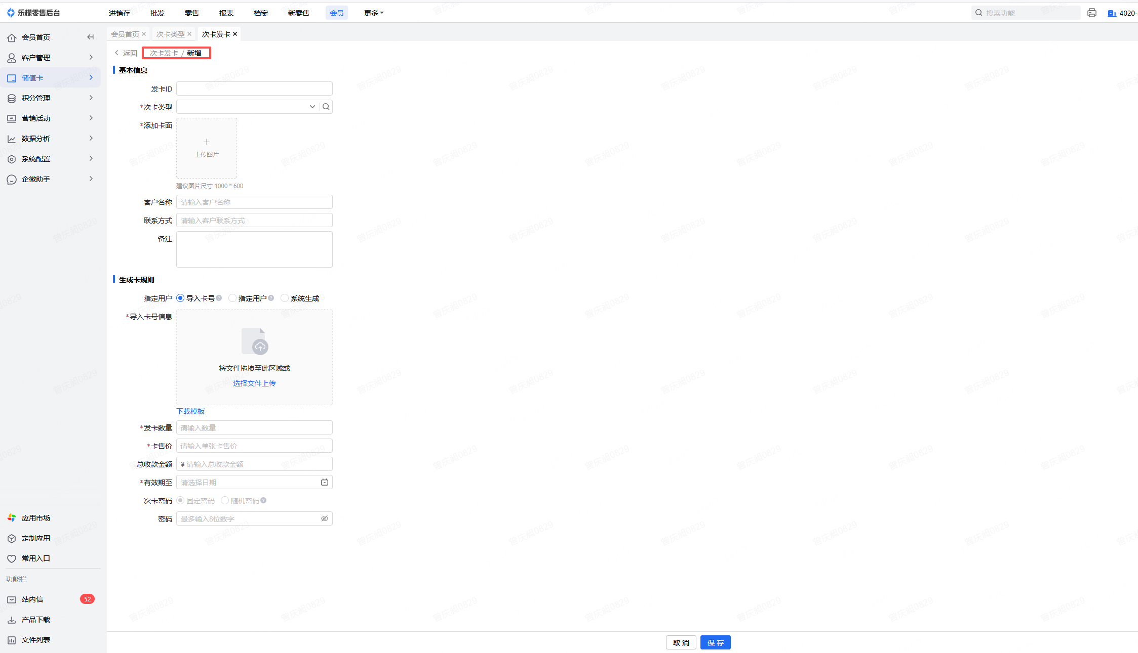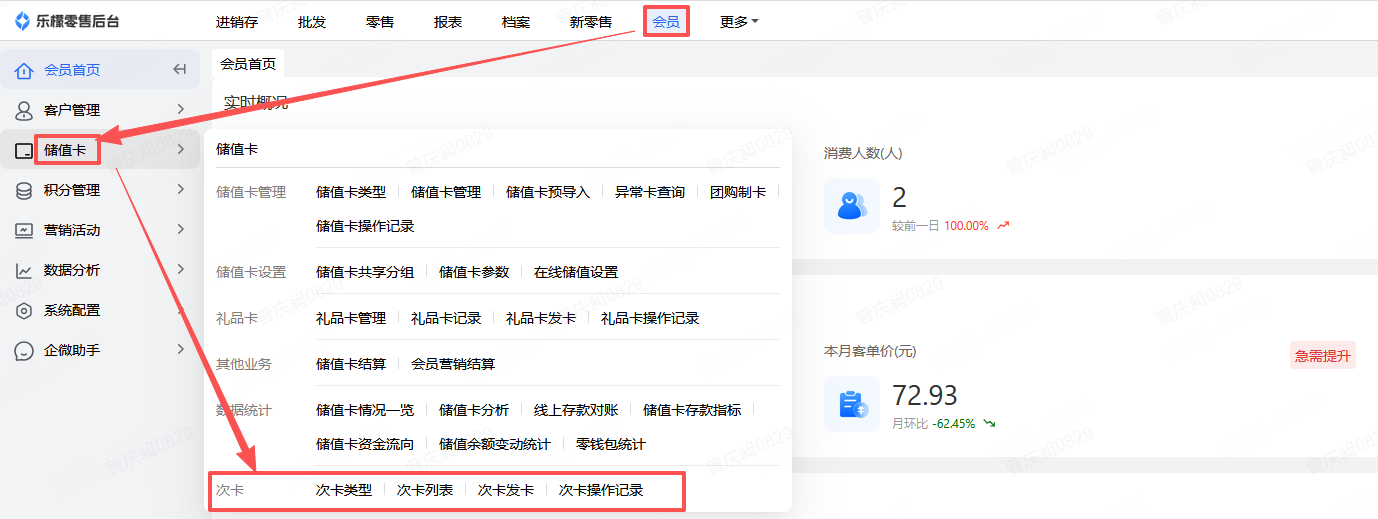 👉【操作路径】:会员-储值卡-次卡
