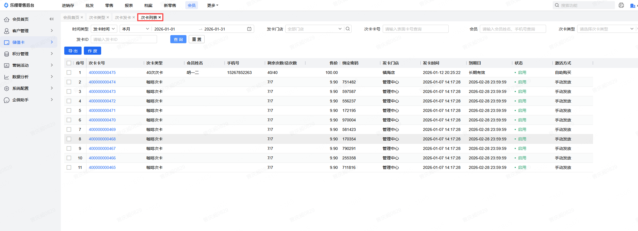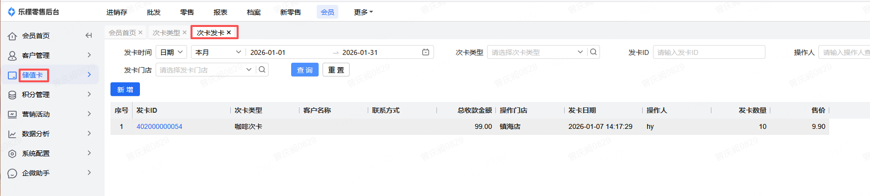 👉【操作路径】:会员-储值卡-次卡列表