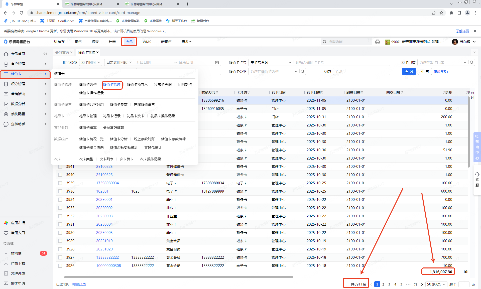 储值卡管理右下方可看到所有储值卡的的总数量、余额,此表包含已发卡门店为停用门店的会员卡、发卡门店为空的会员卡