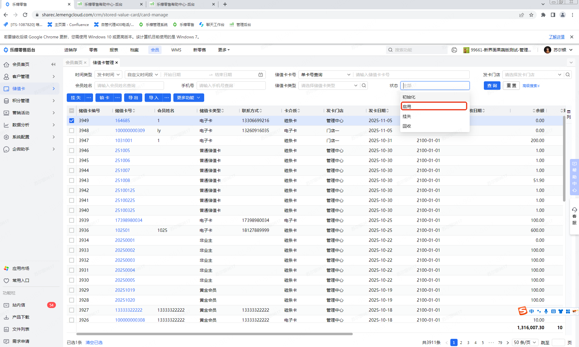 若存在回收的卡,只想查看目前启用的会员卡内余额,可在顶部筛选条件“状态”中筛选启用,即可只查看启用中的卡数据