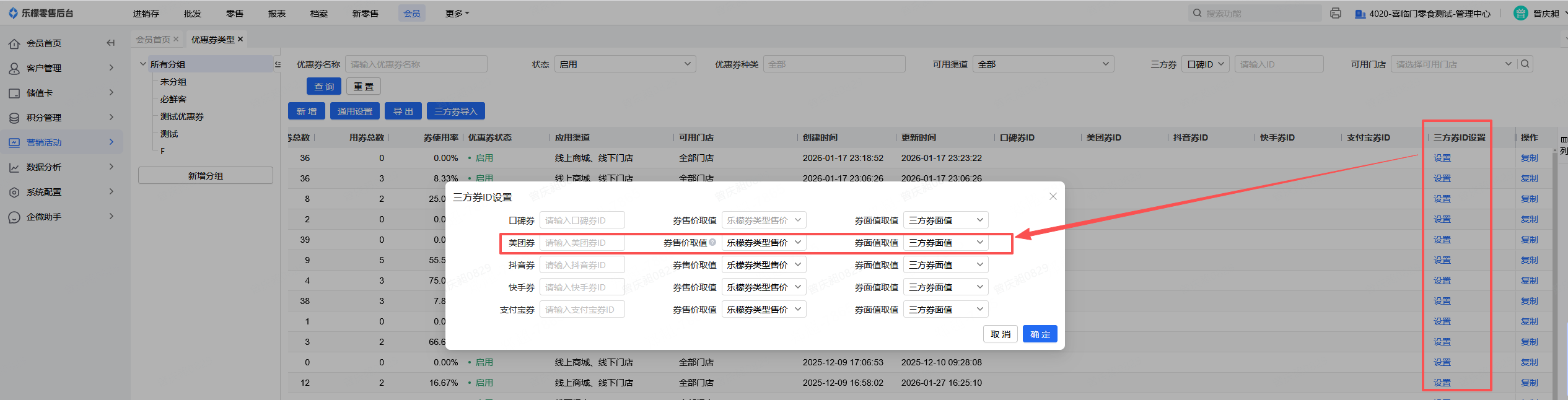美团上建立售卖的代金券,将美团券ID填写到在乐檬后台创建的对应的购物抵用券的第三方券设置里。