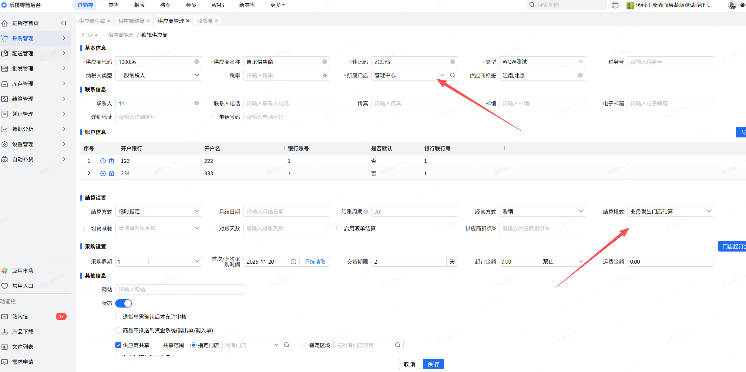 业务发生门店结算:供应商与那个门店发生业务,对应业务单据在自己门店结算
