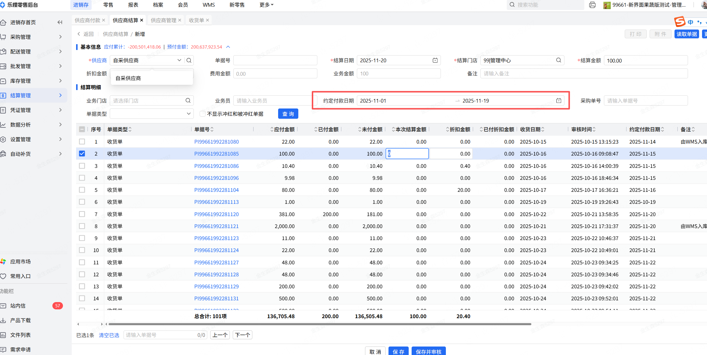 例如收货单的付款日期是04-15,今天是04-05,供应商结算筛选了结算日期04-05至04-10