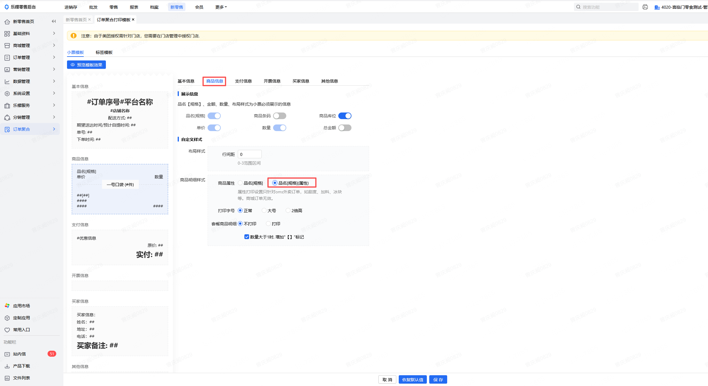 👉【操作路径】:新零售-订单聚合-订单聚合打印模板-商品信息