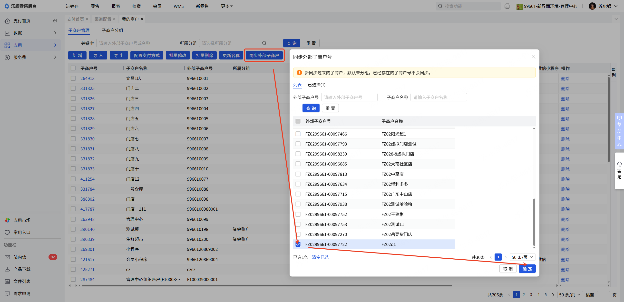在我的商户中检查对应门店外部子商户号是否存在,若不存在可点击”同步外部子商户“