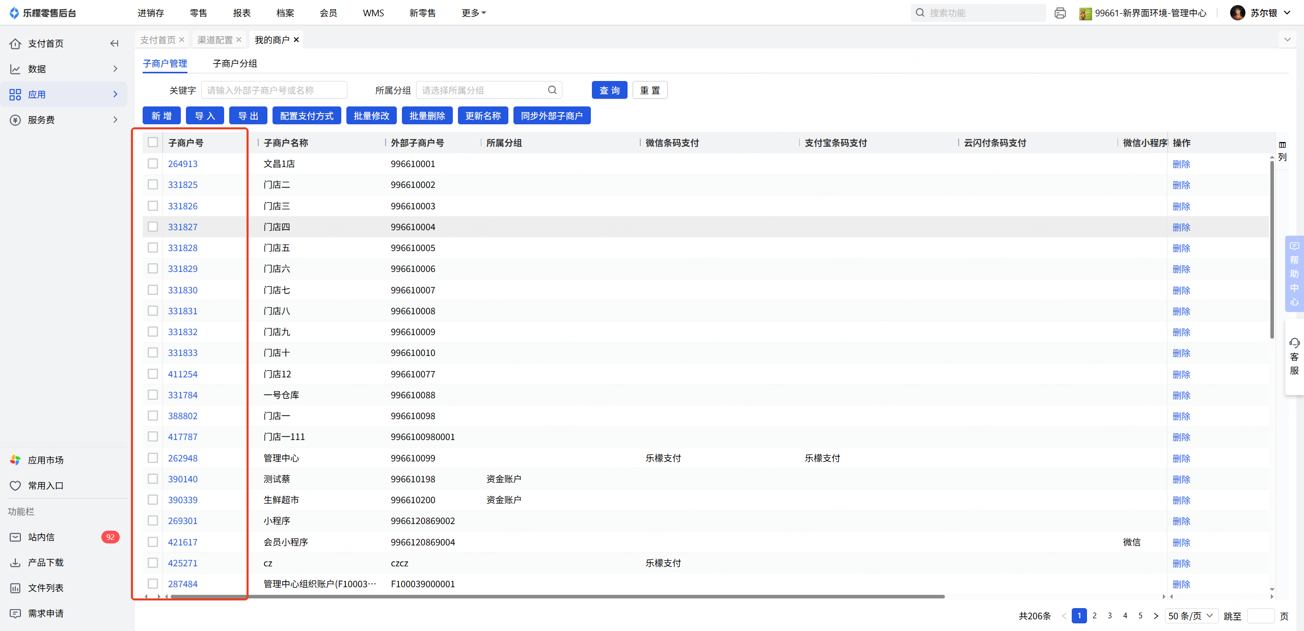 渠道配置乐檬支付界面点击添加子商户,勾选需要配置的门店后在进行选择子商户号(可联系申请支付的客服获取子商户号)