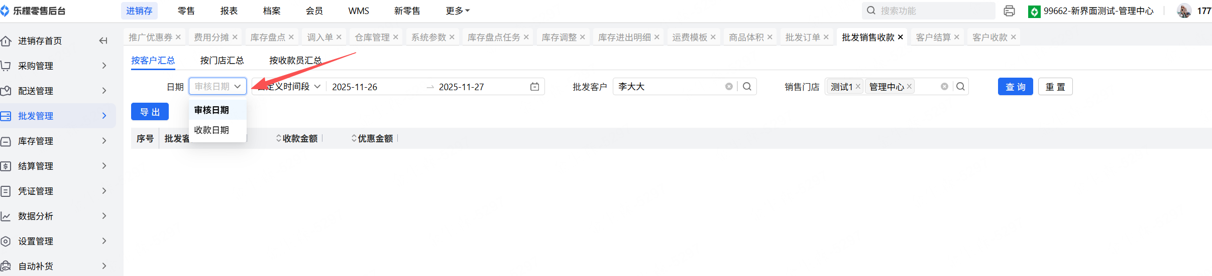 批发销售收款,时间选择审核日期和收款日期正常查询