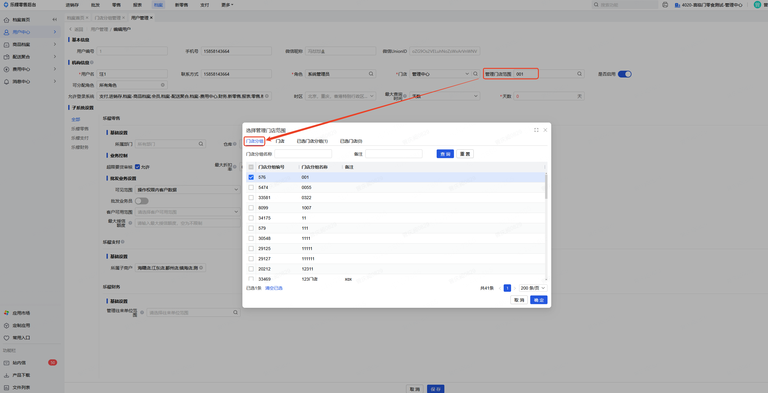 再到上诉点击对应用户的 用户编号进入,管理门店范围选择刚创建的门店分组,然后保存,重新登录即可