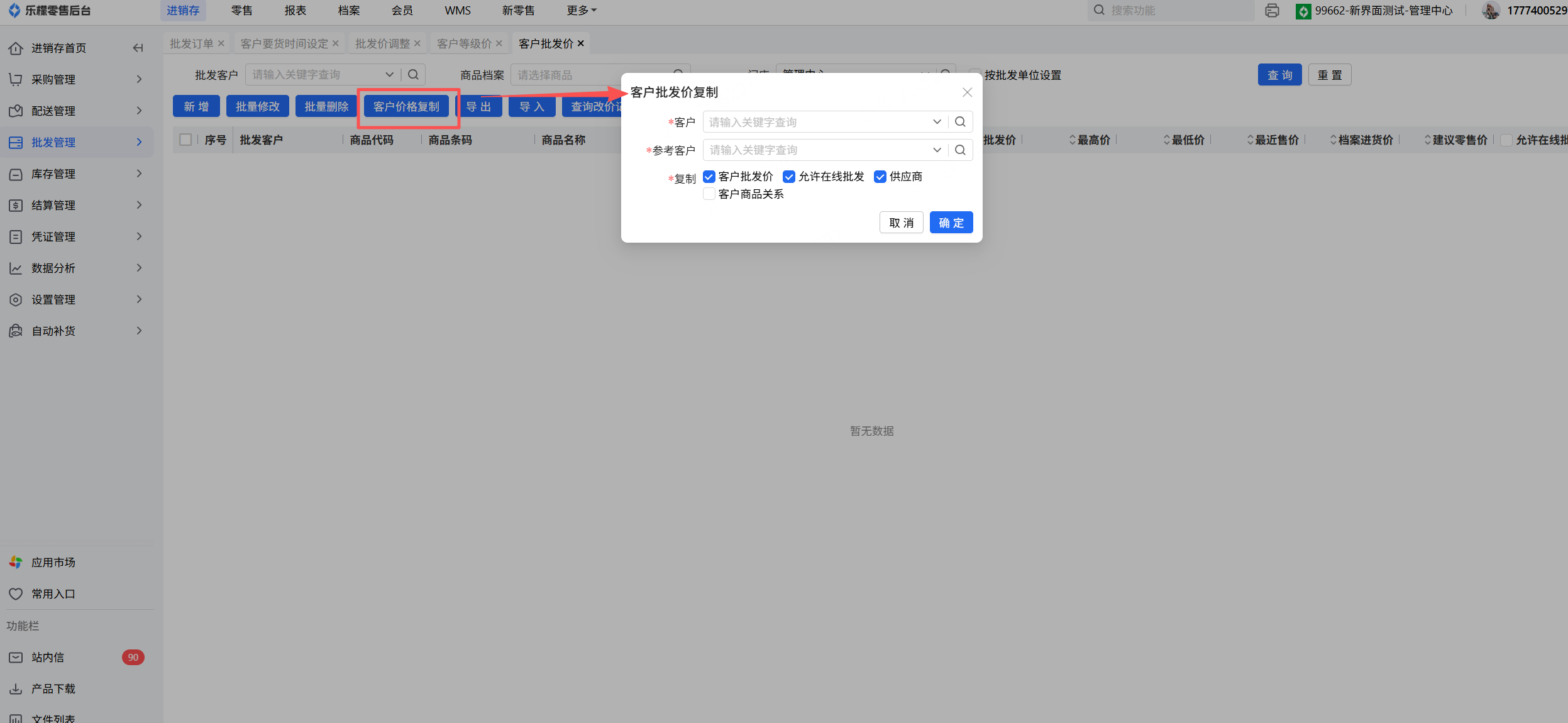 》》选择客户参考参考客户进行复制操作,也可以复制约定价格和不允许订购的勾选项