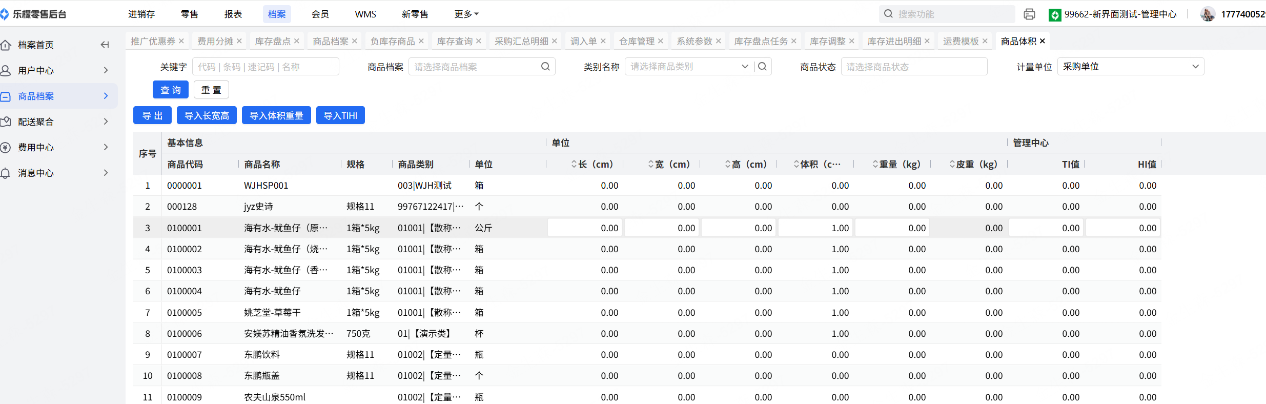 这些数据在档案–商品体积里进行设置。注意不同单位下,商品的体积和重量不同,都需要手动设置。