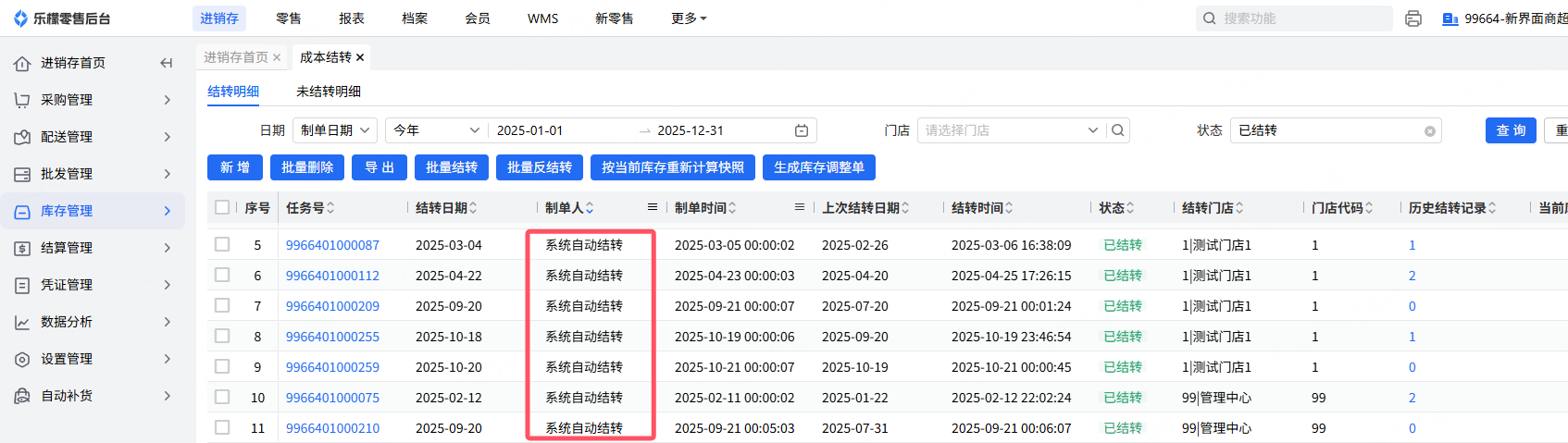 选择日结后,在设置的指定时间会自动生成结转单去结转
