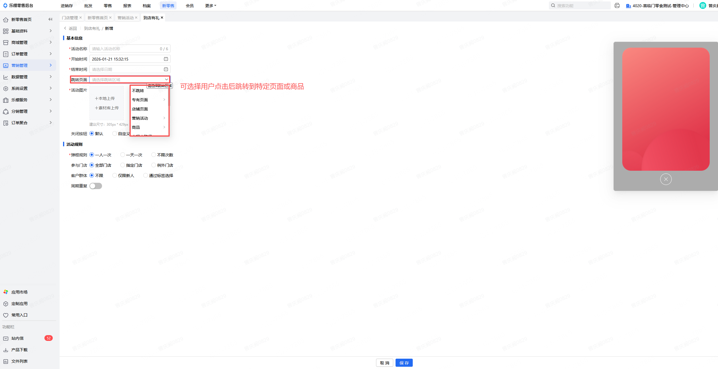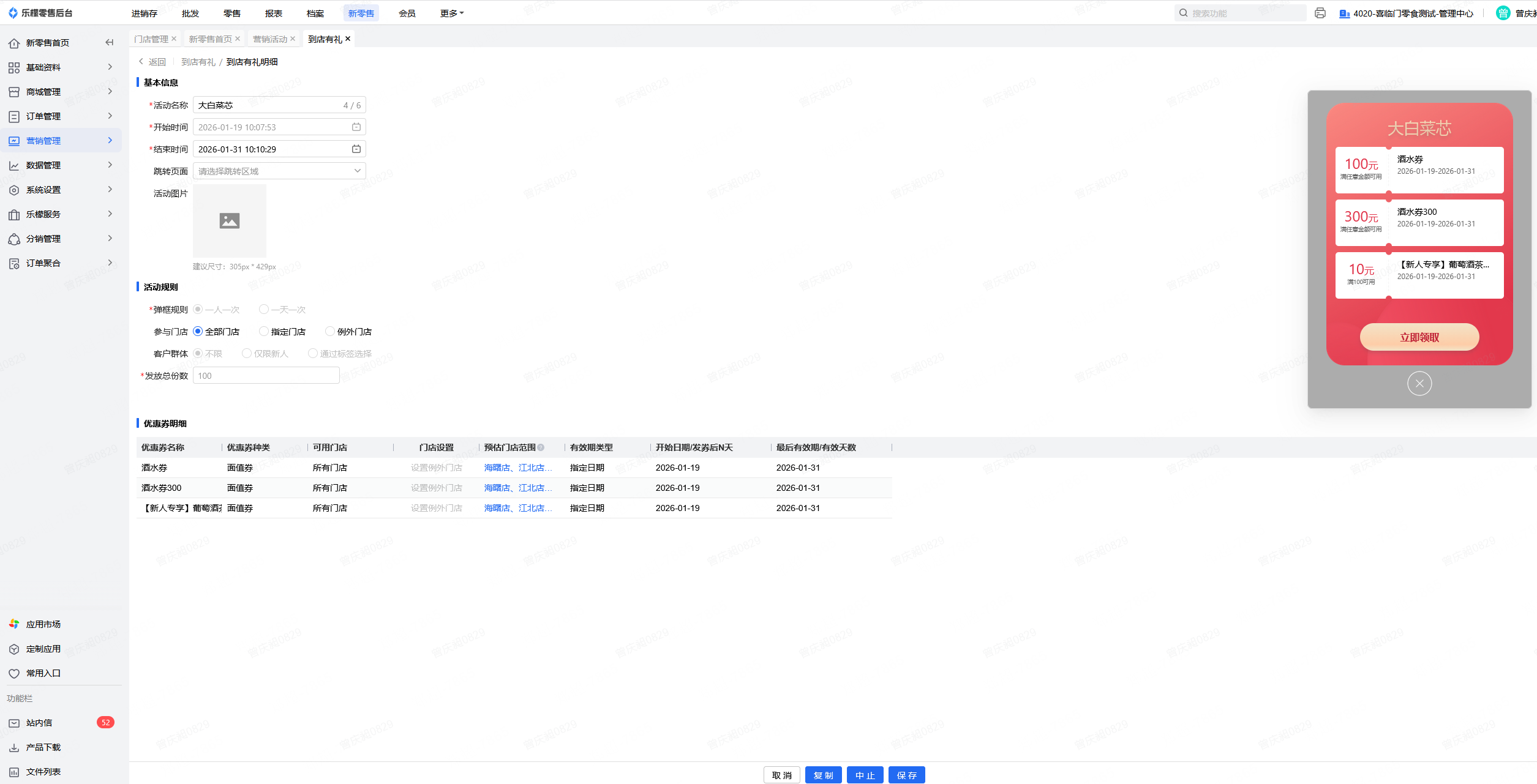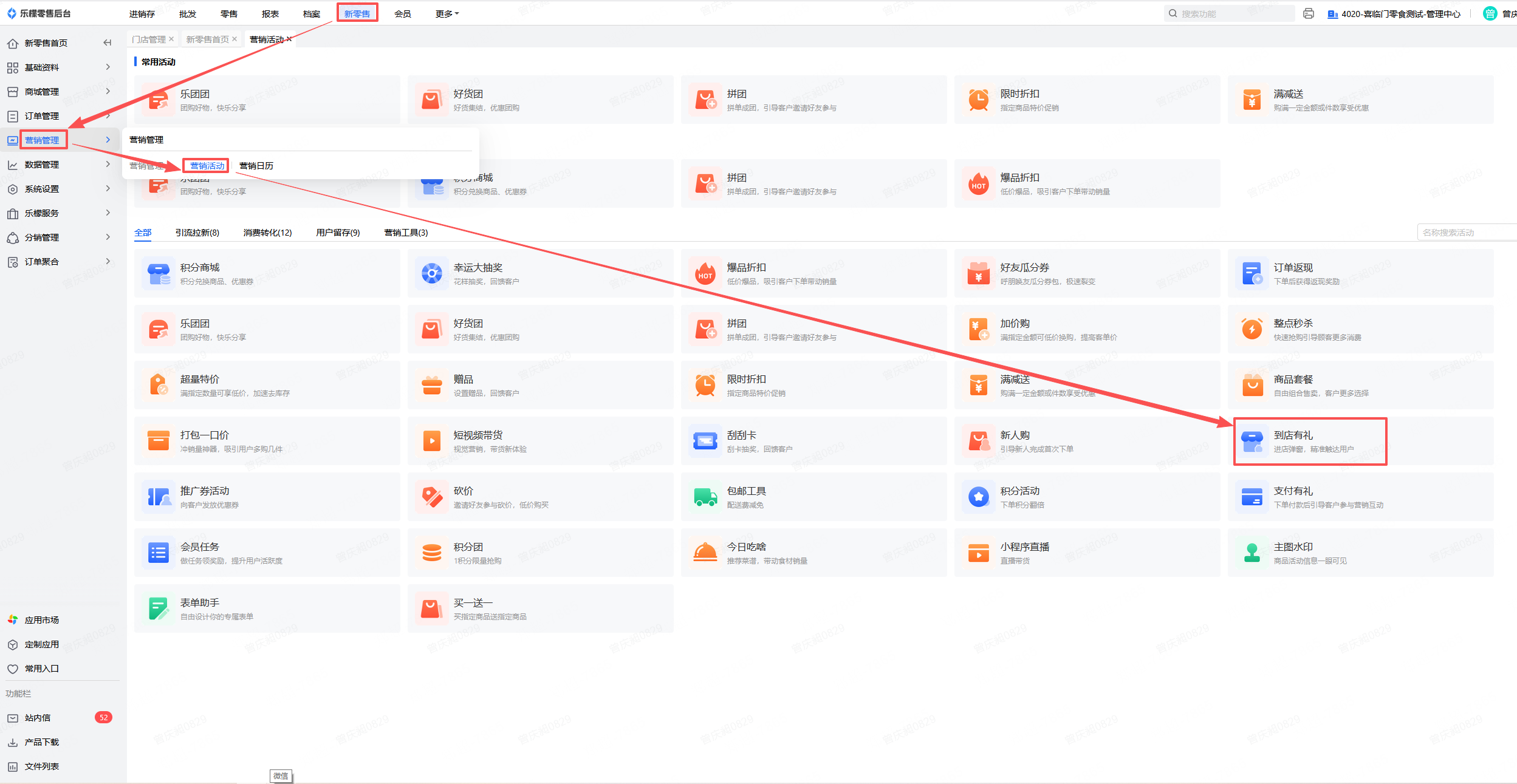 👉【操作路径】:·新零售-营销管理-营销活动-到店有礼