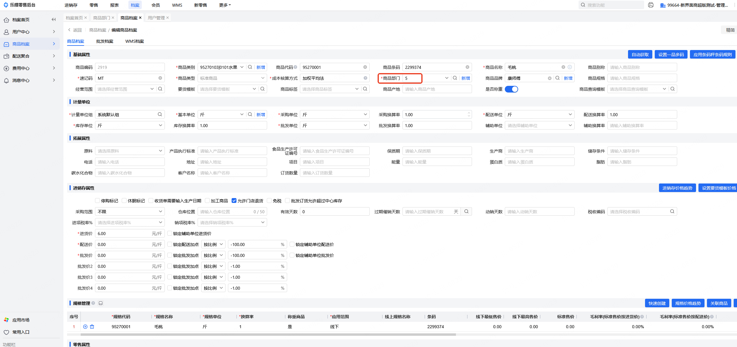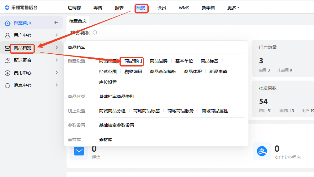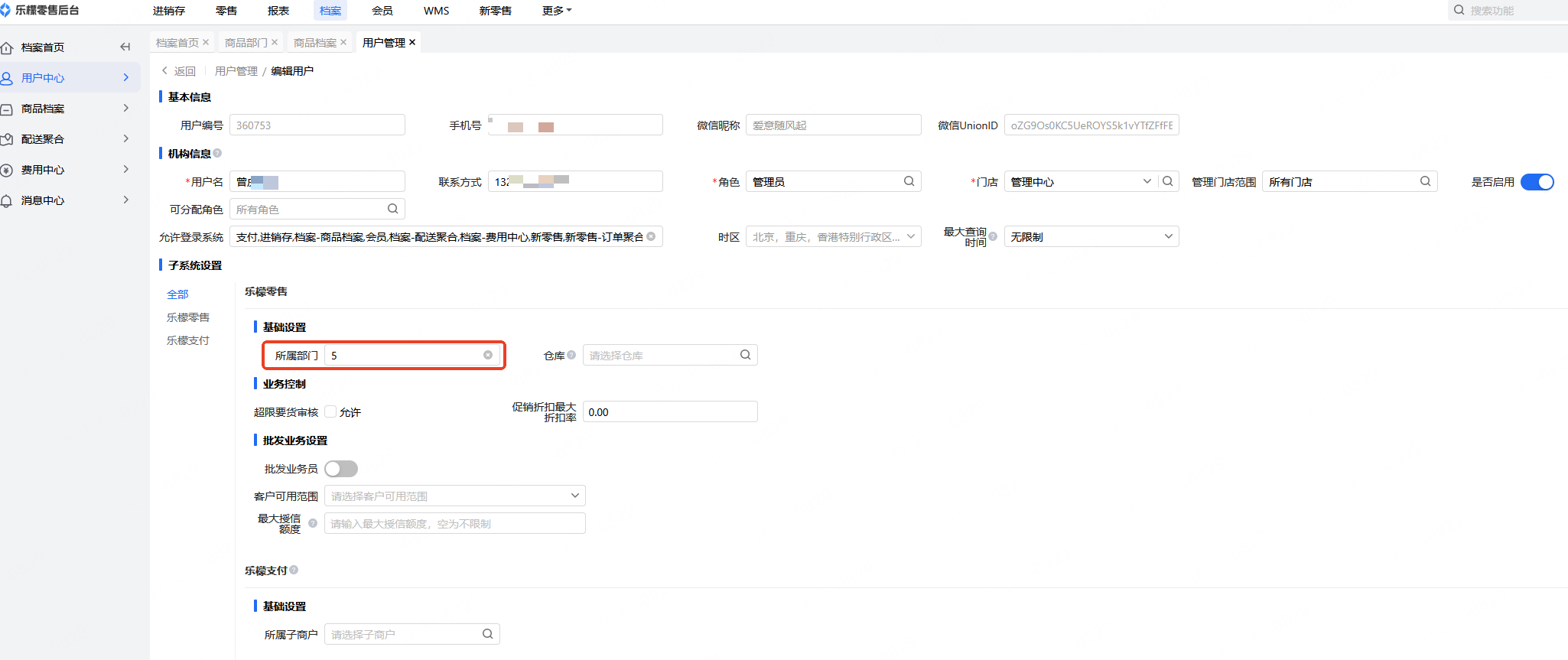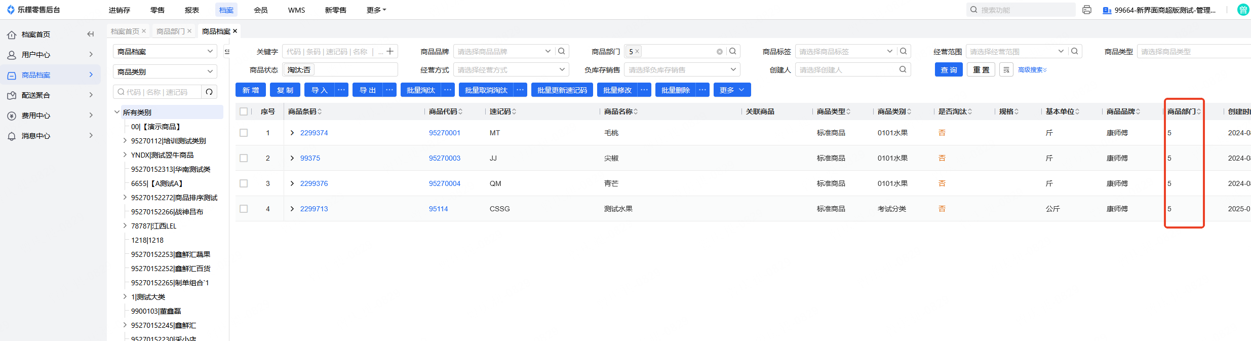举例:商品档案将商品设置到某一个部门中,且档案中心用户也设置在相同部门内